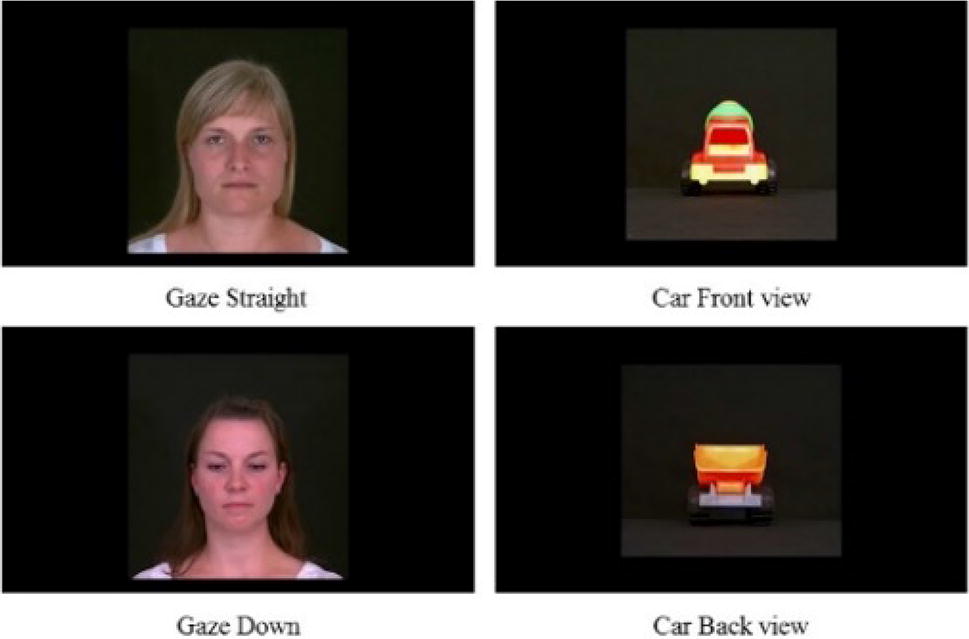 There were 24 trials, including 6 trials of each stimulus type (direct gaze, downcast gaze, car with a front view, or car with a back view). Trials were controlled and presented using E-prime software (Psychology Software Distribution, Pittsburgh, Pennsylvania) in a random order with the constraint that the same stimulus type was presented no more than three times in a row. The inter-stimulus interval varied between 4–6 s. During the experiment, the experimenter monitored the child via a video feed and did not initiate the next trial unless the child was paying attention to the attention grabber on the screen. Short breaks between trials were allowed to help the children focus on the task.