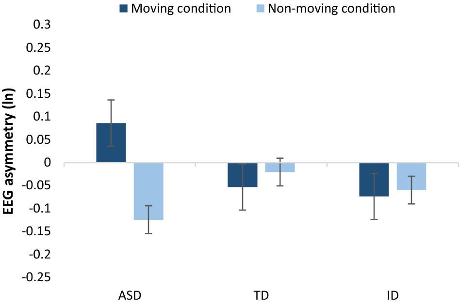 A limitation that should be noted, when making conclusions of the effect of movement in the present experiment, is that the static and the dynamic phases were parts of the same trial and appeared always in the same order, i.e., the former preceded the latter. The stimulus was first static for two seconds and only after that started to move towards the observer. Consequently, we were able to maintain the children’s attention on the screen and made the stimuli look more dynamic and natural than static images. In children with ID and TD children, there were no differences in the brain activity between static and dynamic conditions, when data from all the stimuli were pooled. The children with ASD were the only ones who showed differences in their responses to static and dynamic stimuli. It is possible that the children without ASD learnt to anticipate that the stimulus would loom forward right after the static phase. The anticipation could have affected the neural activity in the static phase of the trial and therefore the difference between the static and dynamic conditions was reduced. In contrast, the children with ASD may have lacked this effect of movement anticipation. Previous studies have shown that individuals with ASD have deficits in anticipating their own movements according to the movements of their social counterparts (Brisson et al. 2012; Schmitz et al. 2003) and in anticipating social sequences (Palumbo et al. 2015; Zalla et al. 2010). In future studies, it is important to present the dynamic and static conditions in different trials to better verify the effect of stimulus movement on alpha-asymmetry.
