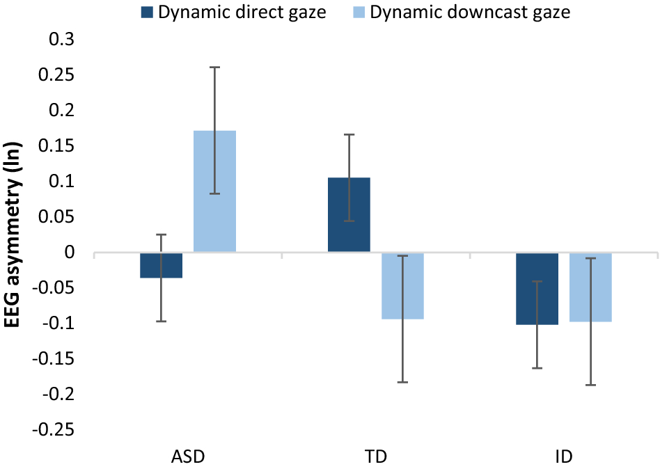 To conclude, this study provides evidence for early abnormalities in motivational responses to eye contact in autistic development. The greater approach-motivation related frontal activity to direct gaze, which appears to be a consistent characteristic of typical development, was not found in children with ASD or ID. In contrast, children with ASD exhibited more approach-related EEG activity to downcast gaze than to direct gaze, whereas children with ID without ASD did not show any difference in their responses to direct and downcast gaze. While some of the results in ASD and ID were unexpected and should be interpreted with caution, they point to group-specific abnormalities in response to social cues in children with ASD and ID, and call for further research on the mechanisms that may explain these differences and the associated difficulties in social behaviour.