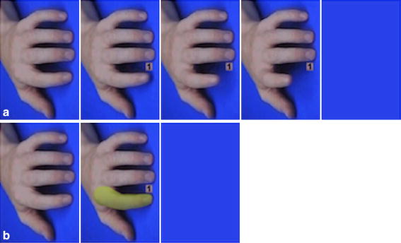a The five-frame action video clip. Frame one was displayed for a variable interval (range: 800–2,400 ms). Frames two and three were displayed for 34 ms each and frame four for 500 ms. These display durations ensured the appearance of a short video clip. The fifth frame (a black screen) remained on screen until the duration of the trial had reached 3,000 ms and the participant had returned both fingers to the letters V and B on the keyboard. b The three frames of a ‘baseline’ trial. Frame one was displayed for a variable interval. Frame two was displayed for 568 ms and the final frame was displayed until the duration of the trial had reached 3,000 ms and the participant had returned both fingers to the letters V and B