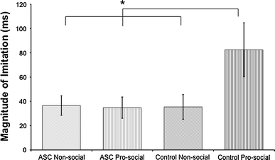 Pro-socially primed participants in the Control Group imitated more than non-socially primed participants. Participants with ASC showed no such social modulation of imitation: the degree of imitation shown by the ASC Pro-social Group did not differ from that shown by the ASC Non-social Group. Furthermore the Control Pro-Social Group showed significantly greater imitation than the ASC Pro-social Group. In contrast, the Control and ASC Non-social Groups did not differ. *Indicates p < 0.05