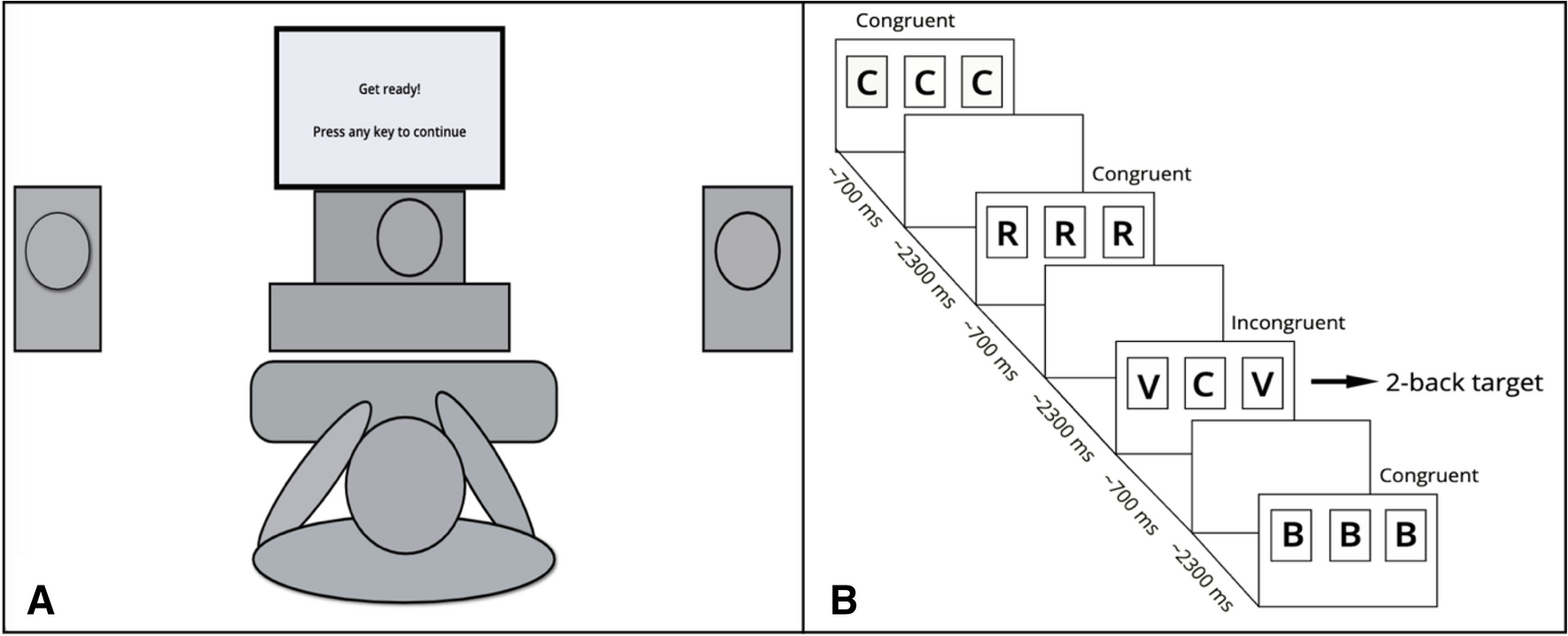 Four n-back load levels were used (0-back, 1-back, 2-back, 3-back), each level constituting a separate block of trials. Each block consisted of 120 trials, half of which were n-back targets. Two-thirds were congruent (i.e., central loudspeaker and flanking loudspeakers presenting the same letter), whereas one-third were incongruent (i.e., central loudspeaker and flanking loudspeakers presenting a different letter). This proportion was selected based on the study by Scharinger et al. (2015) to ensure that flankers were sufficiently distracting, since prior research has demonstrated that attention is more focused when there is a higher proportion of incongruent trials (e.g., Gratton et al., 1992; Logan and Zbrodoff, 1982; White et al., 2011). Moreover, incongruent trials were never followed by incongruent trials to avoid conflict adaptation, the so-called Gratton effect (Gratton et al., 1992). The first four trials were always congruent non-targets and were removed from any analysis. In the 0-back condition, participants were instructed that a certain letter (randomly selected among S, H, T, Q, B, V, G, or C) was the target and that on each trial they had to respond whether the letter presented by the central loudspeaker was the target or not by pressing the appropriate response key. As for the 1-, 2-, and 3-back conditions, participants had to respond whether the currently presented letter was the same as the letter heard one, two, or three trials back, respectively. The order of the four experimental n-back blocks was randomized for each participant and breaks were allowed between the blocks. Before the experimental trials, all participants completed training blocks of 20 trials for each n-back level. The threshold for proceeding to the next level was 60% accuracy. During training, participants’ accuracy was displayed at the end of a block for feedback. No feedback was given for experimental blocks. Overall, this task lasted approximately 30 min.