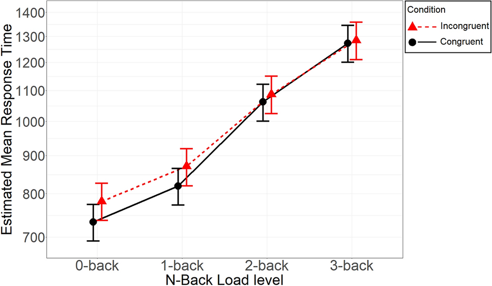 Our primary hypothesis regarded the two-way interaction between n-back level and the congruency effect. Both factors are within-participants: n-back Load (0-back, 1-back, 2-back, and 3-back; 2-back was the baseline level) and Congruency (flanker stimuli: congruent vs. incongruent flankers; congruent was the baseline level). As regards Load, 2-back was set as the baseline because we expected reduced a congruency effect in the 2-back condition compared to 0- and 1-back conditions, but no further increments in this facilitation mechanism in the 3-back condition. Setting 2-back as the baseline for the Load factor was the most direct way to formalize our expectations. The dependent variable was RTs of correct trials. Accuracy was also examined in a separate analysis.
