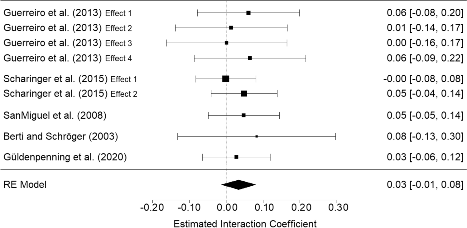 Forest plot and overall meta-analytic estimate for the interaction parameter (gamma family). Note The effects refer to the interaction parameter of interest, which is the estimated difference in the Congruency effect in a “low” vs. a “high” Load conditions. Positive values indicate larger congruency effects in “low” than in “high” Load conditions. (For interpretation of the metrics, see the text or find more easily interpretable linear parameters in Figure S6 in Supplemental Materials.) Error bars represent 95% CIs