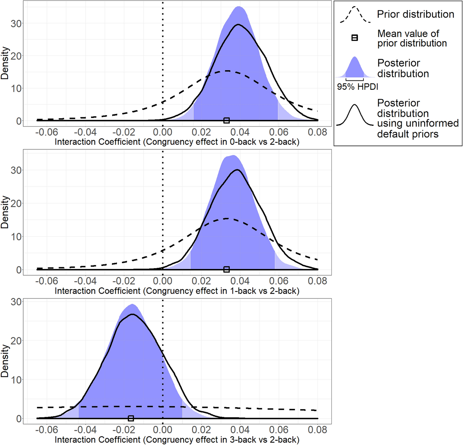 As we set the “high” Load condition (2-back) as the baseline in our analysis, and we considered the alternative levels 0- and 1-back as “low” load levels, we directly used the meta-analytic estimate of 0.033 as the mean values of the (Normal) prior distributions for these two parameters (note that a regression parameter for a categorical factor represents the comparison between the alternative level [i.e., low load] and the baseline level [i.e., high load]). The SDs of these parameters were set at 0.024, which corresponds to the SE of the meta-analytic estimate. As detailed in the Supplemental Materials, Section 1, we assumed that 3-back could represent an even higher Load condition than 2-back. However, in the preregistration it was noted that we would expect no further increment in the congruency effect at the 3-back as compared to the 2-back level. Therefore, we set the mean prior value for the “3-back vs 2-back” parameter at only half the meta-analytic estimate, and we set large uncertainty on its distribution (i.e., five times the SD used for the other parameters, or SD = 0.12), which was practically equivalent to a non-informed prior distribution, as shown by the very flat prior distribution in the bottom panel of Fig. 4. Lastly, for the “3-back vs 2-back” parameter the comparison no longer indicated “low vs high Load” (as in the “0-/1-back vs 2-back” parameters), but “very high vs high Load”. Therefore, here we had to invert the sign of the meta-analytic estimate (i.e., we had to use a negative instead of positive sign).