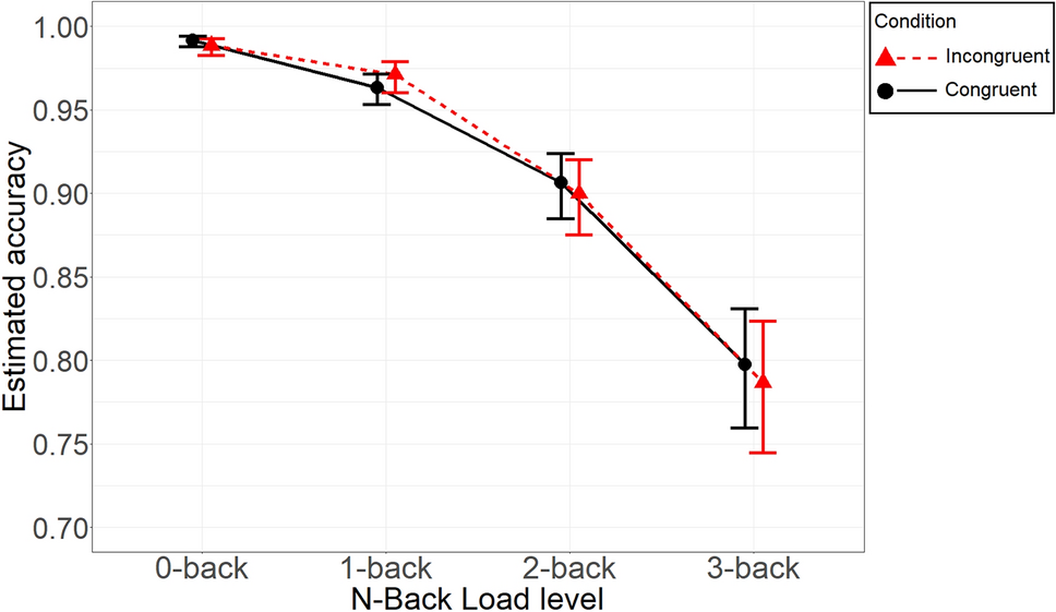 Estimated probability of correct response as a function of Load and its interaction with Congruency. Note Error bars represent 95% Bayesian credible intervals of the posterior estimates calculated with the percentile method