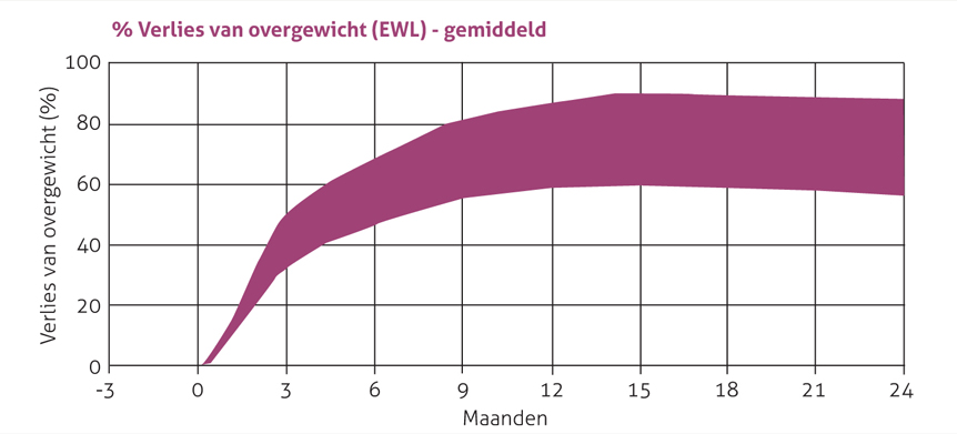 De resultaten worden uitgedrukt in EWL (extra weight loss). Dit betekent het verlies van de kilo’s overgewicht (figuur 3). De Nederlandse Obesitas Kliniek (NOK) heeft op grond van de gegevens van hun patiënten (n=2267, gemiddelde leeftijd 44, vrouw: man 83:17 procent) die een gastric bypass kregen tussen 2012-2015 berekend hoeveel procent van hun overgewicht verloren werd in de eerste twee jaar na de ingreep.