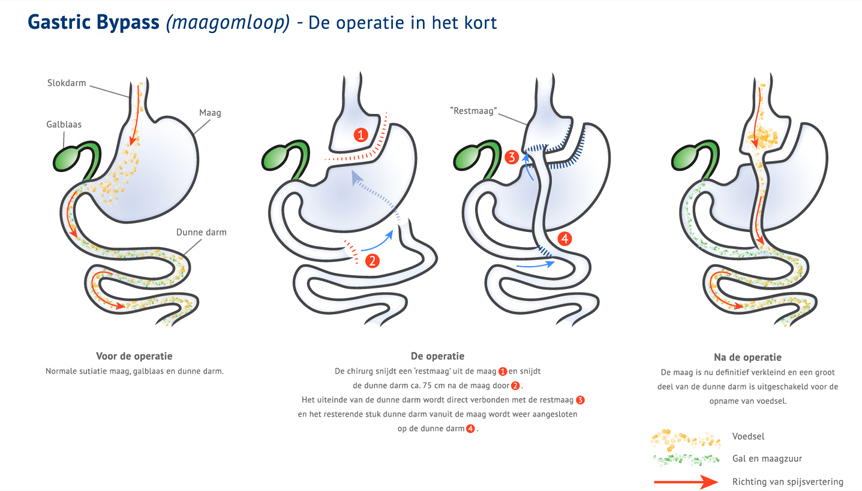 Bij een gastric bypass wordt de maag verkleind en slaat het voedsel een deel van de dunne darm over (afbeelding 1). Er zal dus minder voedsel worden opgenomen.