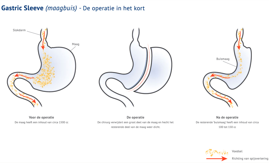 Bij een sleeve-operatie verwijdert de chirurg een groot deel van de maag (afbeelding 2). De maag (normaal 1,5 liter) wordt hierdoor een soort buis met een veel kleinere inhoud (grootte van een banaan). Het is dus een restrictieve ingreep. Het spijsverteringskanaal blijft wel normaal, maar omdat de maag kleiner is en er minder maagzuur gevormd wordt is er ook sprake van malabsorptie.