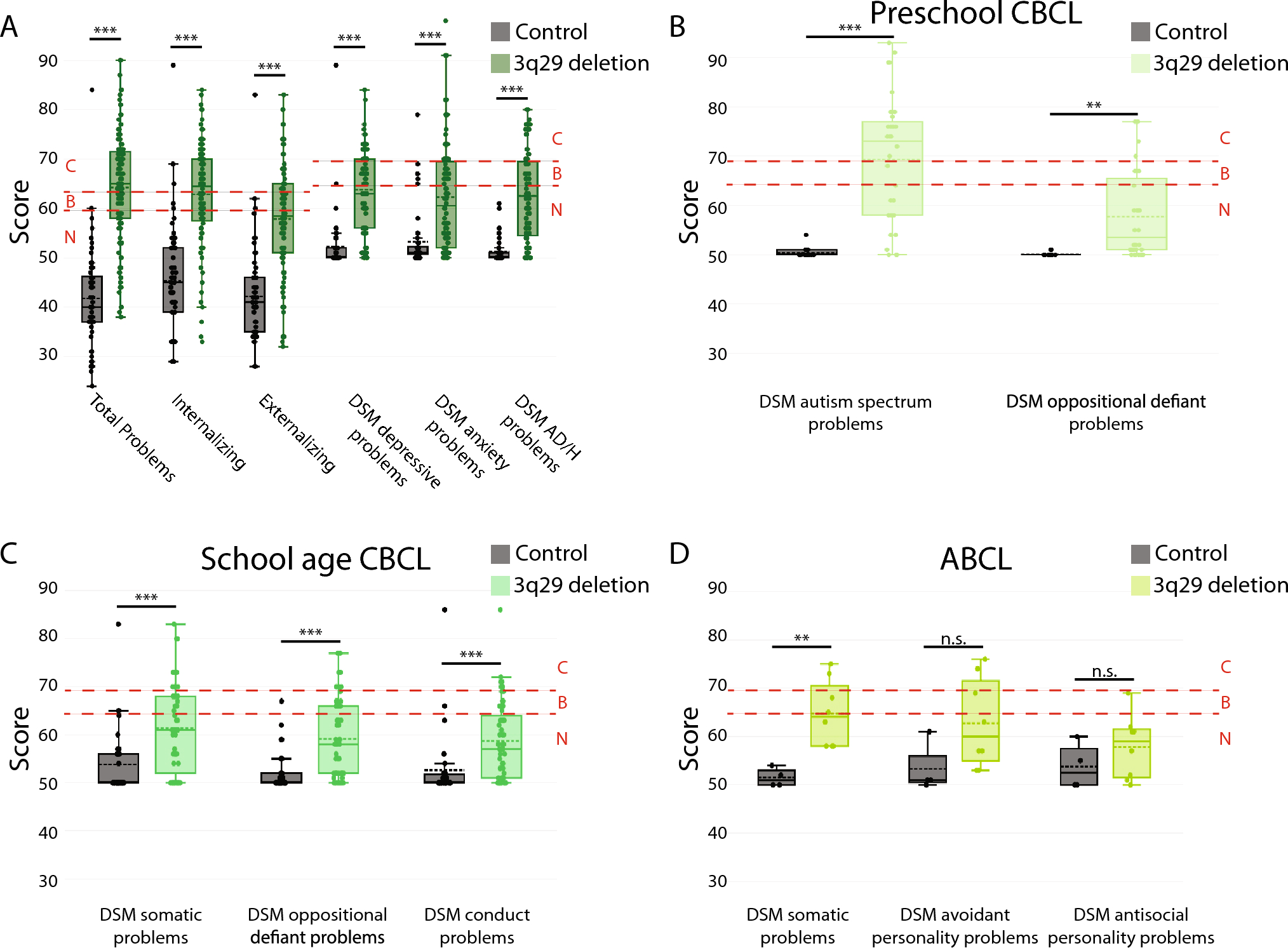 Distribution of scores on the A shared CBCL/ABCL composite and DSM-keyed scales (n = 96 3q29del, 57 control), B DSM-keyed scales unique to the preschool CBCL (n = 32 3q29del, 18 control), C DSM-keyed scales unique to the school age CBCL (n = 56 3q29del, 35 control), and D DSM-keyed scales unique to the ABCL (n = 8 3q29del, 4 control) for study participants with 3q29del and controls. Dashed red lines denote the cutoffs for the Borderline and Clinical score classifications. N normal, B borderline, C clinical, AD/H attention-deficit/hyperactivity, n.s. not significant; **p < 0.01; ***p < 0.001
