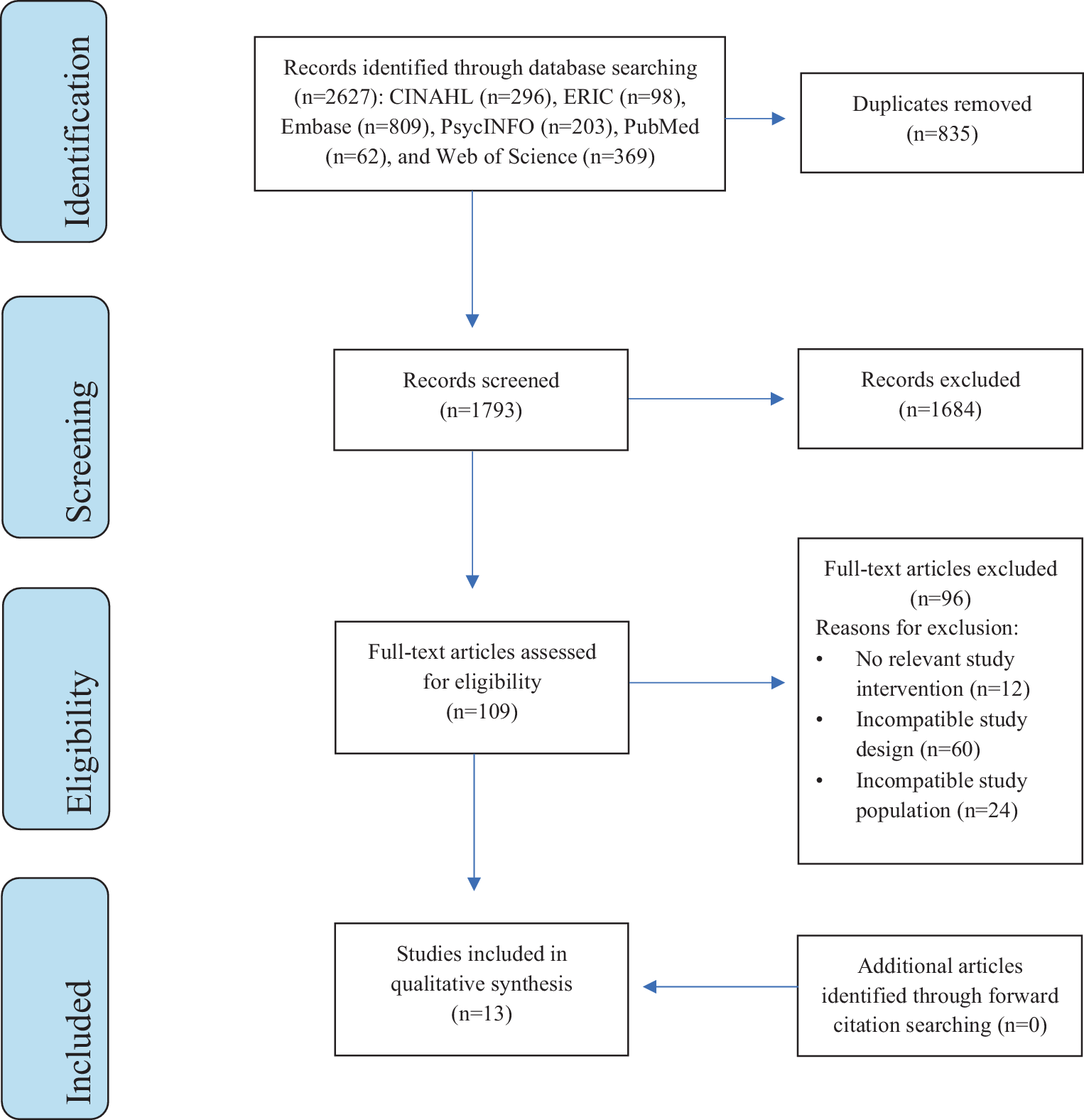 After removing duplicates, 1793 potential studies were identified (Fig. 1). After screening titles and abstracts, the full texts for 109 studies were comprehensively reviewed. In total, 96 were excluded due to incompatible study design (60), incompatible study population (24), and incorrect intervention (12). Forward reference searching was performed but did not identify any eligible studies for systematic review. This strategy yielded thirteen studies included in the review [9, 23‐33].