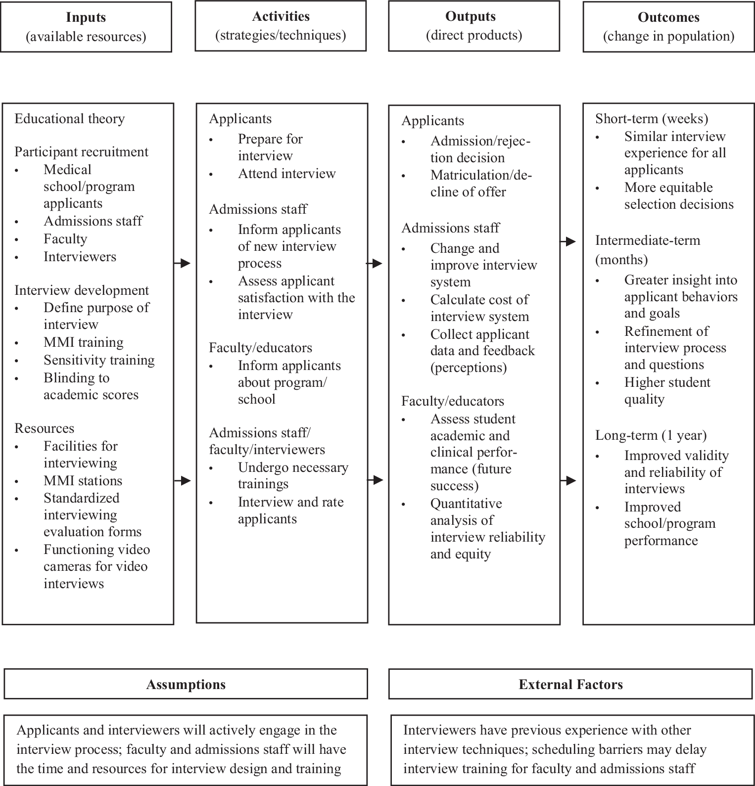 Admissions decisions, matriculation choices, improvements to interview process, and quantitative data were targeted outputs in the model. In the short term, interviewees will receive similar interview experiences and more equitable selection decisions. In the intermediate term, there will be improved understanding of interviewees, a more valid and reliable interviewing process, and a student body that better aligns with the goals of the admissions office. In the long run, schools and programs will improve interview reliability and interviewee perceptions and altered composition of the student body will improve the academic performance of students. The relationship between each approach to interviewing and its outcomes should be assessed to evaluate the effectiveness of an interviewing intervention.