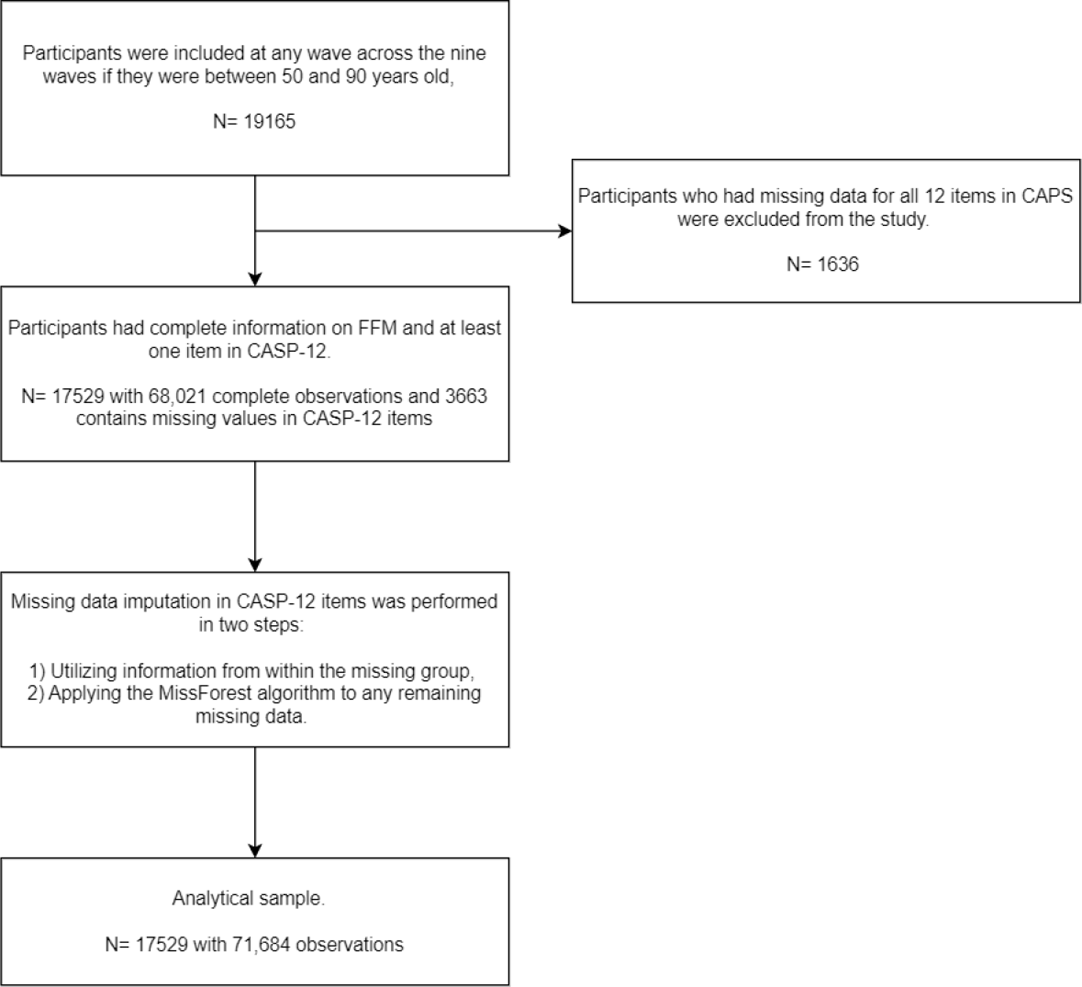 In this study, 19,165 participants aged 50–90 reported at least one measure of frailty or QoL across the nine waves. The number of missing values for the frailty measure was quite small, while for the QoL measure, it was around 10 to 15% (see Table 3 in the supplementary information). Most of the missing values were for the whole CASP-12 items while others were for a part of the QoL items. As a result, the observations with missing values in the frailty measure were removed and the missing values for the whole CASP-12 items. Regarding the missing items on the QoL measure (1 to 11 items), two different methods were used sequentially to impute the missing values, see below, for the cases where one item at least responded to. The analytical sample size was 17,529. Figure 2 shows The procedures for the analytical sample.