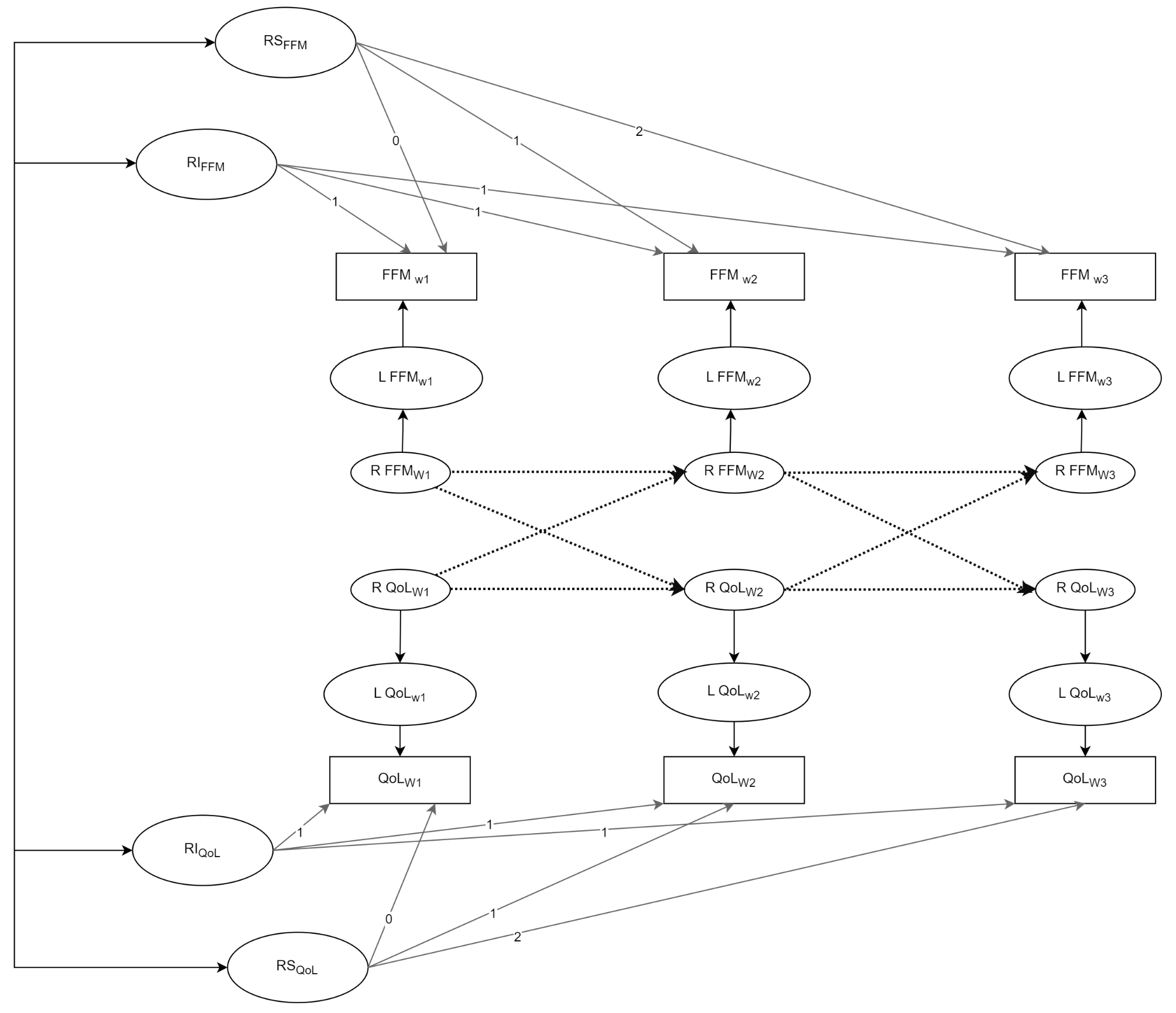 The model group’s analysis was based on model B’s specifications. The models that included gender showed differences in the within-person effects. The autoregressive parameters of CASP-12 across the nine waves were higher for females, while the autoregressive parameters of FFM were higher for males (see Table 8 in the supplementary information). Thus, previous CASP-12 scores will have a greater impact on later CASP-12 scores in females, while FFM scores will have a higher impact on later FFM scores in males. Additionally, the cross-lagged parameters from CASP-12 to FFM were higher for males, while the cross-lagged parameters from FFM to CASP-12 were higher for females. Thus, previous CASP-12 scores will have a greater impact on later FFM scores in males, while FFM scores will have a higher impact on later CASP-12 scores in females. At the group level, the means of the RI for CASP-12 were similar in both genders, around 27. The mean of RI for FFM was higher in females than in males, with 0.15 and 0.13, respectively. The means of RS factors for CASP-12 and FFM were similar in both genders. The inverse correlation between RS factors for CASP-12 and FFM was higher in males (see Table 10 in the supplementary information).