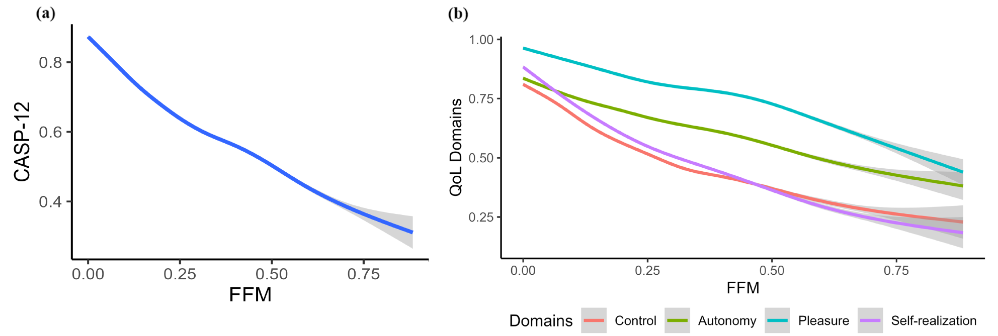Regarding multiple group analysis for age, the autoregressive parameters of FFM across the nine waves were higher for the oldest participants (70–90). Additionally, the cross-lagged parameters from CASP-12 to FFM and vice versa were higher for the most senior participants across the nine waves. The inverse association between CASP-12 and FFM within-person level at the same time point is similar for the participant age (50–69) and the group of oldest participants age (70–90) across the nine waves. At the group level, the means of the RI for CASP-12 were similar in both age groups. However, the mean of RI for FFM was higher in oldest than older participants, with 0.15 and 0.13, respectively. Also, the means of the RS factors differed for CASP-12 and FFM: both RSs tend to be steeper in the oldest participants. The inverse correlation between the RI and the RS factors for CASP-12 and FFM was higher in the oldest participants (see Table 10 in the supplementary information). So, age impacts the inverse relationship between frailty and QoL, and it is more pronounced among the oldest participants.