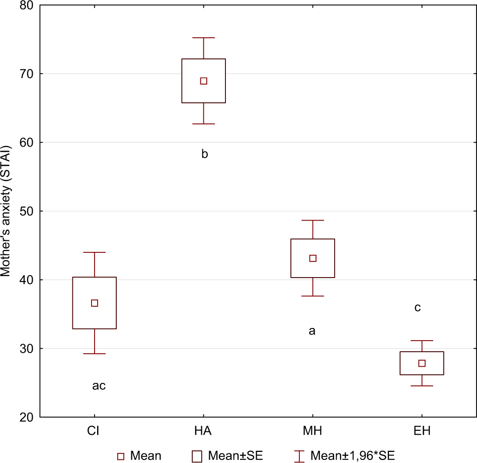 Mother’s anxiety level grouped by children with different hearing damages and enhancing devices. CI–Profound Hearing Loss with Cochlear Implant, HA–Profound Hearing Loss with Hearing Aids, MH–Mild to Moderate Hearing Loss without Enhancing Devices, EH–Efficient Hearing. Different letters indicate statistically significant differences (p < 0.05)