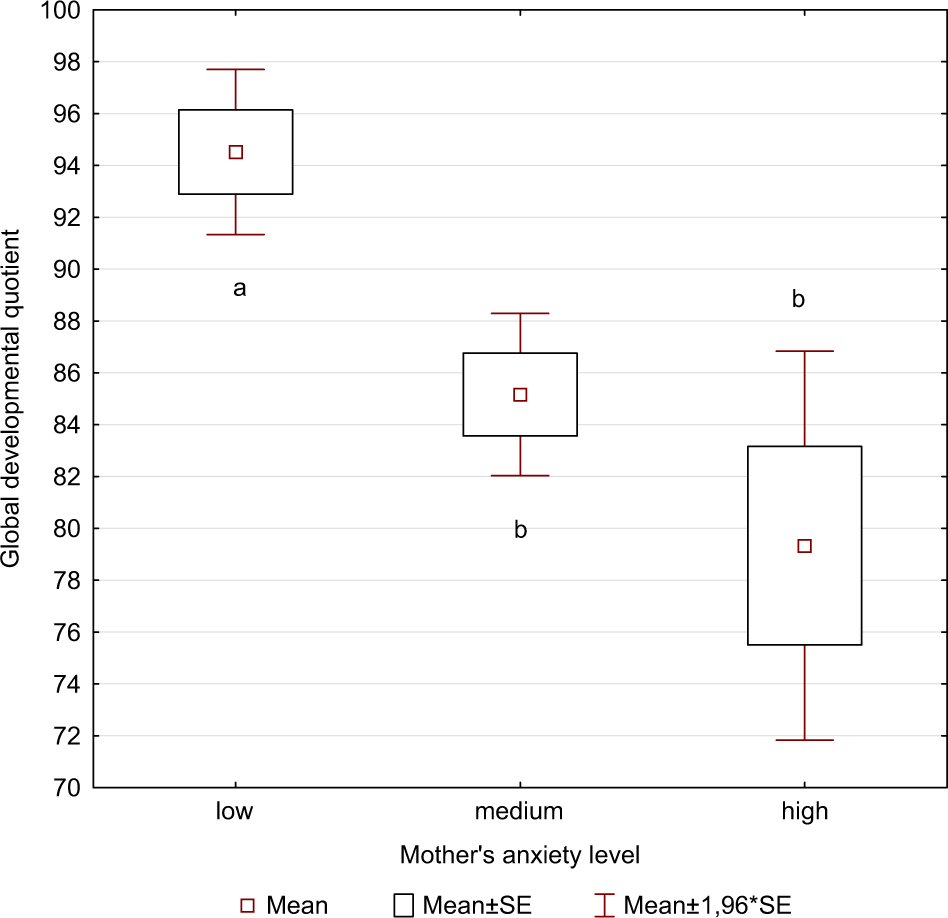 Global development quotient of children grouped by mother’s anxiety level determined by STAI questionnaire. Different letters indicate statistically significant differences (p < 0.05)