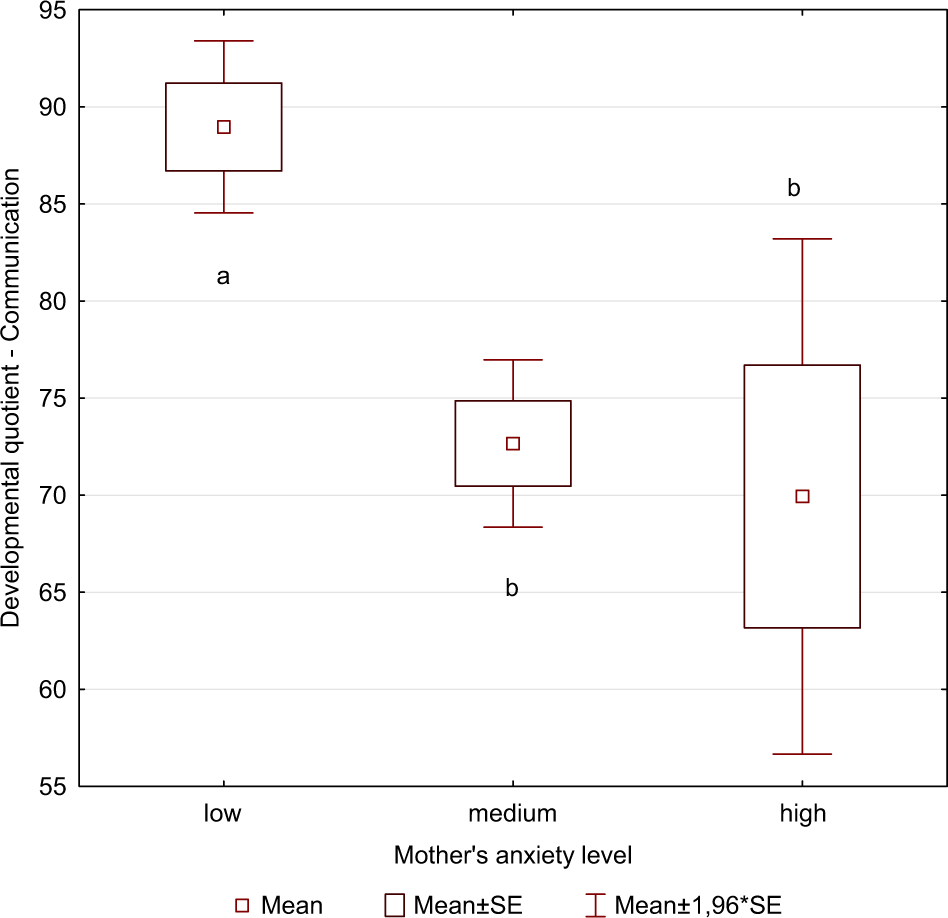 Communication skills of children grouped by mother’s anxiety level determined by STAI questionnaire. Different letters indicate statistically significant differences (p < 0.05)