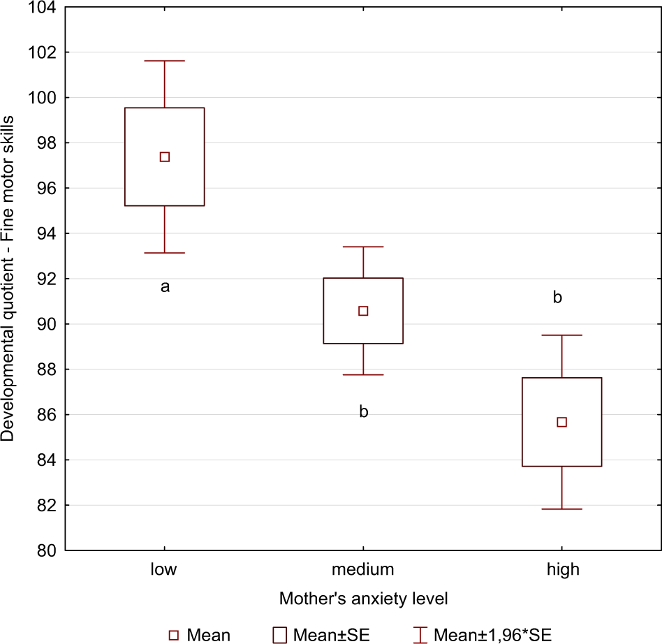 Fine motor skills of children grouped by mother’s anxiety level determined by STAI questionnaire. Different letters indicate statistically significant differences (p < 0.05)