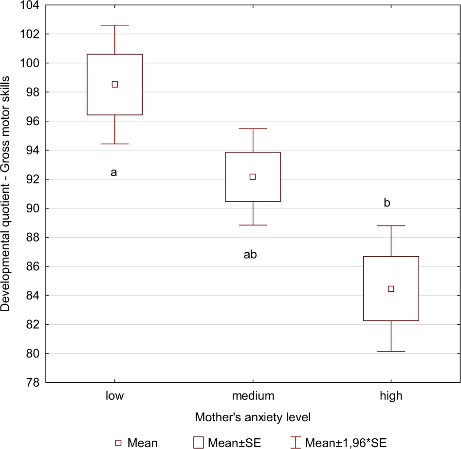 Gross motor skills of children grouped by mother’s anxiety level determined by STAI questionnaire. Different letters indicate statistically significant differences (p < 0.05)