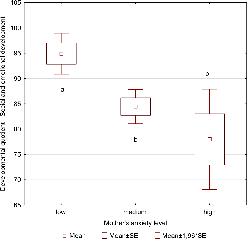 Social and emotional development of children grouped by mother’s anxiety level determined by STAI questionnaire. Different letters indicate statistically significant differences (p < 0.05)