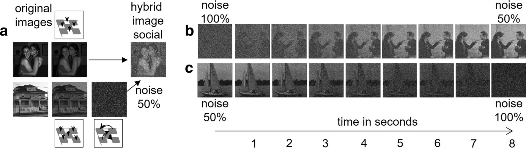 Trials started with hybrid images with 50% noise (i.e., randomly shuffled pixels of one of the two composite images, the other of the two composite images being arranged correctly). Subsequently, the correctly ordered pixels were shuffled incrementally over the course of 8 s, too, so that the visible image dissipated into noise (see Fig. 1c). During the increase in noise participants were instructed to indicate via space-key press the moment in time when the image became unrecognizable.