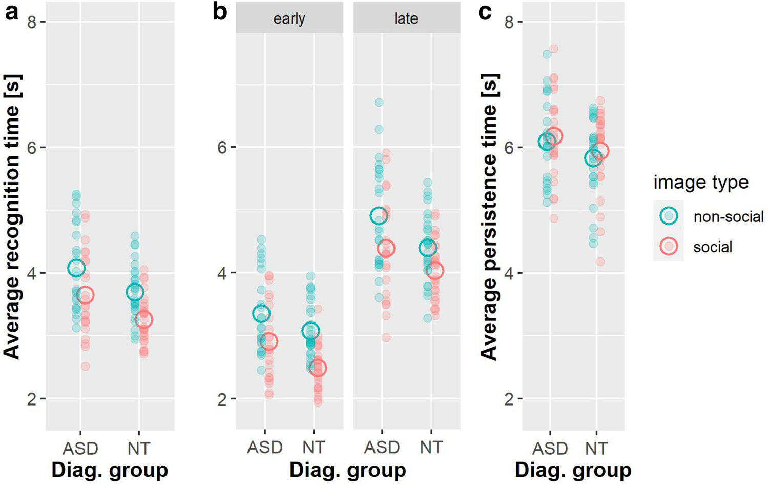 Response times across diagnostic groups and image type during “emergence” of the images. Individual participant’s average response times are depicted by small, filled circles, group averages are depicted by big open circles. Responses on social images are shown in red, responses on non-social ones in blue. a Recognition times for the complete data set. b Recognition times split into two subsets of early responses and late responses. c Persistence times during “dissipation” back into noise. Persistence times for the complete data set