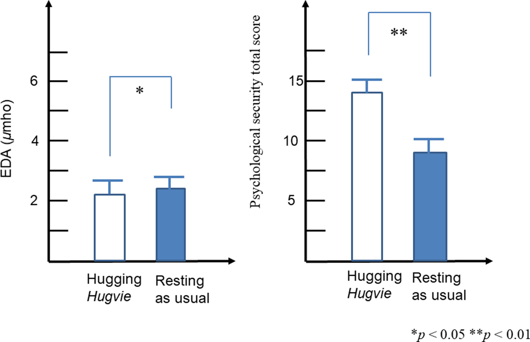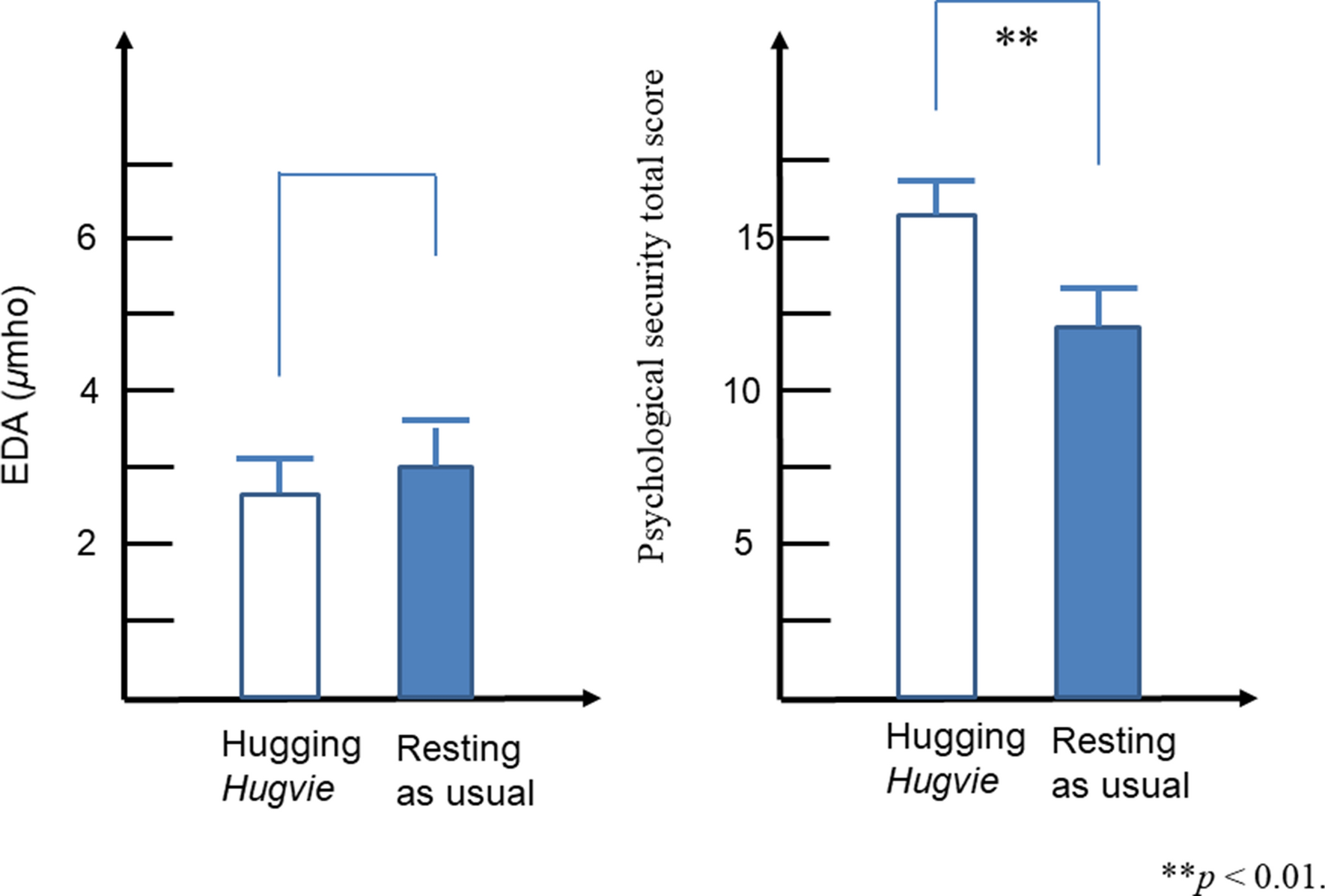 Differences of the EDA and psychological security total score in the conversations with CommU between hugging Hugvie and resting as usual condition