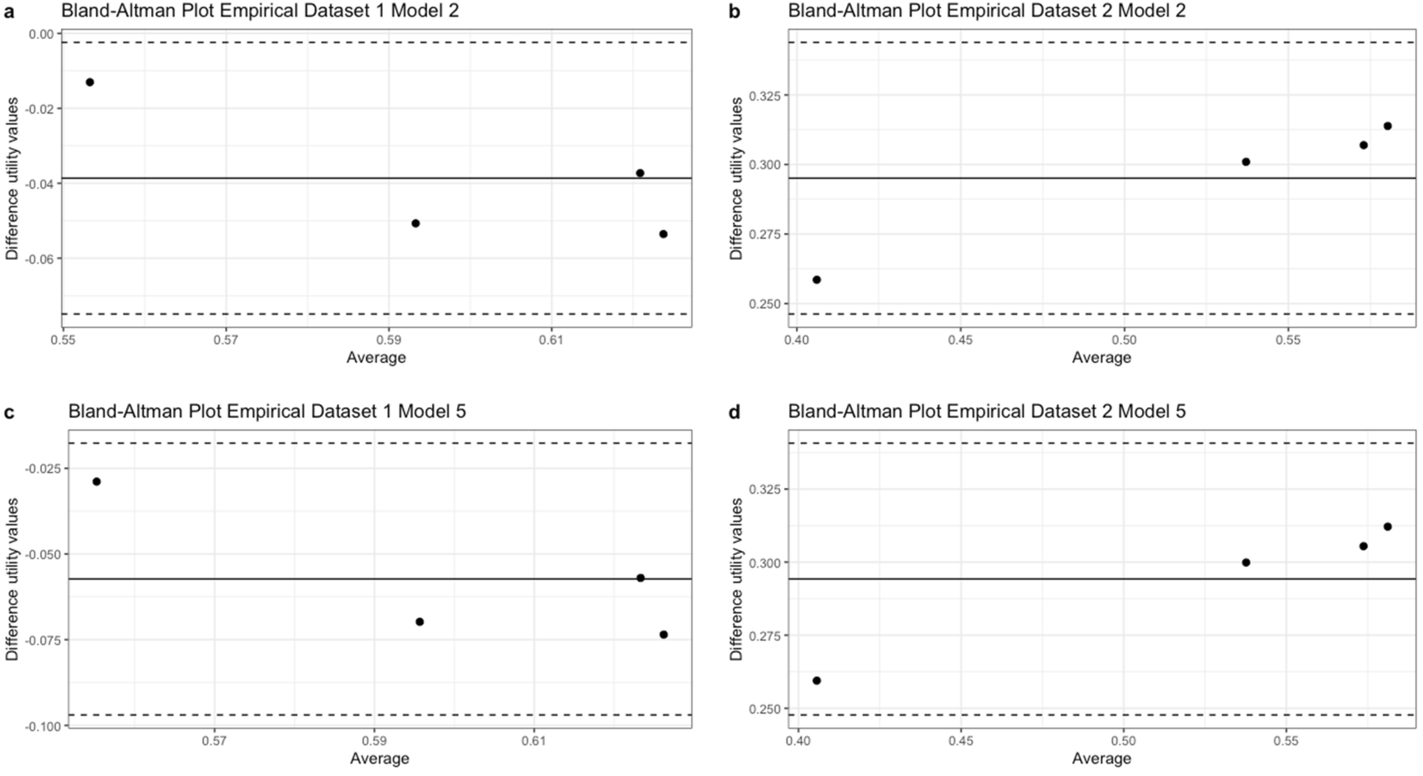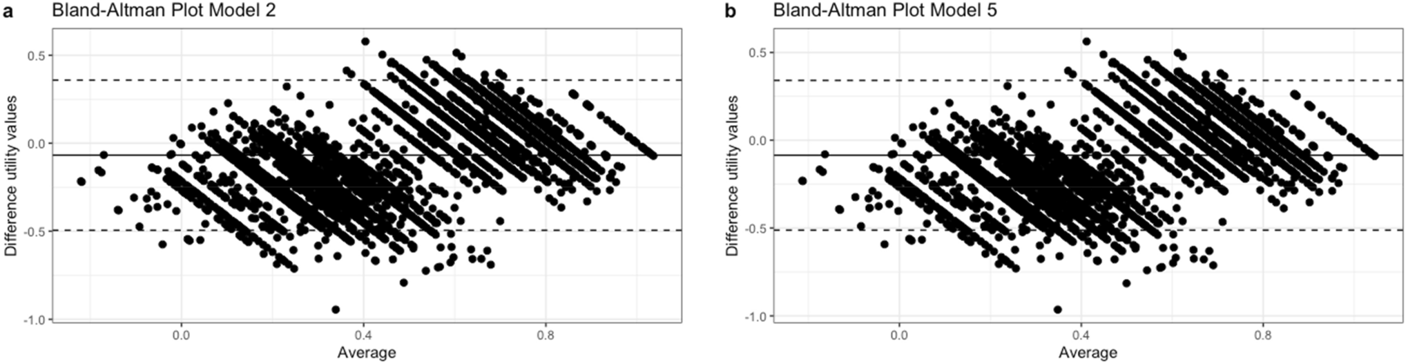 To assess the models’ impact on cost-effectiveness outcomes, complete cases from two randomized controlled trials were used, i.e., empirical dataset 1 (n = 68; Apeldoorn et al. [29, 30]) and empirical dataset 2 (n = 424; Maas et al. [23‐25]). In both studies, QALYs were estimated based on both the actual EQ-5D-3L scores (i.e., actual QALY values) and based on the patients’ ODI scores (i.e., predicted QALY values). Agreement between the actual and estimated EQ-5D-3L based utility values was assessed by performing a Bland Altman analysis for each of the empirical datasets.