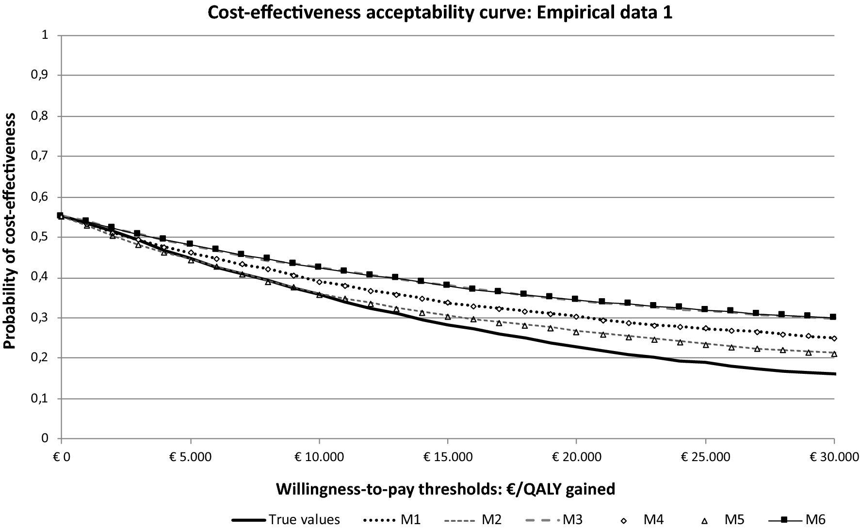 Then, full trial-based cost-effectiveness analysis were conducted for each of the six models as well as the patients’ actual QALY values (i.e., QALYs based on the measured EQ-5D-3L scores). For each trial-based cost-effectiveness analysis, mean differences in costs and QALYs between treatment groups were estimated using seemingly unrelated regression analyses. Incremental Cost-Effectiveness Ratios (ICERs) were calculated by dividing the difference in costs by the difference in effects. Uncertainty around cost and QALY differences was estimated using bootstrapping. The percentage of bootstrapped cost-effect pairs was reported per quadrant of the Cost-Effectiveness Plane (i.e., north east, south east, north west, and south west). Subsequently, Cost-Acceptability Curves (CEACs) were plotted. CEACs indicate an intervention’s probability of cost-effectiveness compared to control for a range of willingness-to-pay (WTP) values (i.e., thresholds of 0, 30,000 euro and 50,000). These probabilities were assessed on their decision sensitivity (i.e., how sensitive is the conclusion of a cost-effectiveness analysis is to using a particular statistical method) [58] . Analyses were performed in R software, version 3.4.0.