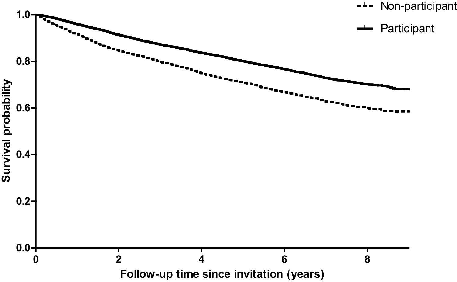 Kaplan–Meier curves of the unadjusted survival function were estimated for participants and non-participants. Cox proportional hazard regression models were conducted to assess the unadjusted and adjusted differences in all-cause mortality between participants and non-participants. Survival duration was specified as time from invitation for participation in a study until either death or censoring date (February 1, 2017). Because time between diagnosis and invitation for participation in the study was highly variable (0–12 years), patients with a shorter time since diagnosis might have a higher mortality risk compared to patients that already lived longer after diagnosis [20]. To adjust for this survivorship bias, a variable with the left-truncation time (time between diagnosis and invitation for participation in the study) was added as an argument and time of invitation for participation was set as entry time [21]. The model was additionally adjusted for covariates controlling for factors influencing survival. In addition, subgroup analyses were conducted to assess whether survival between participants and non-participants differed between age groups.