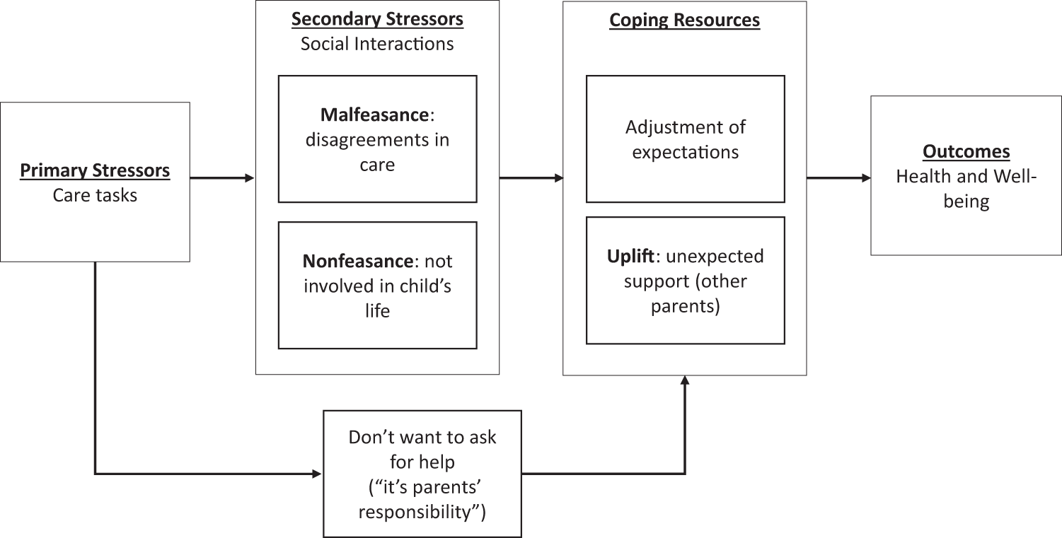 The qualitative data provided an in-depth understanding of how malfeasance, nonfeasance, and uplift operate in the unique context of caring for relatives with rare or undiagnosed diseases and how they intersect with the key elements of the Stress Process Model (i.e., primary stressor, secondary stressor, coping resources). As shown in Figure 1, caregivers explained that primary stressors of caregiving can give rise to malfeasant interactions (secondary stressors) among heavily involved caregivers as multiple people try to do what they believe is best for the child. Interpersonal strain can also arise from nonfeasant behaviors (secondary stressors), when family members are not a part of the child’s life in ways that caregivers view are meaningful. When faced with these primary and secondary stressors, caregivers may cope by either adjusting their expectations for their family members or turning to outside support such as friends or others who also care for a relative with a rare or undiagnosed disease who understand and provide uplift that facilitates coping.