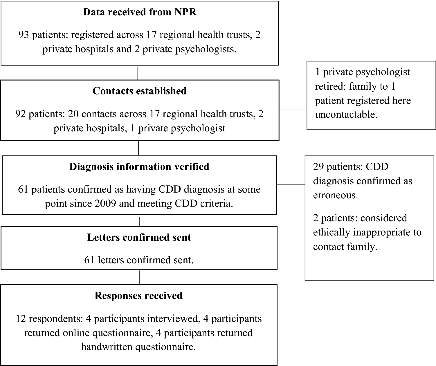 Stage 2 of the process comprised all treatment service contacts receiving an encrypted email of patient-identifying information from NPR. The contacts used this information to ascertain the patient’s family’s address from the journal system and forward the family the invitation to take part in the study. Before sending invitations, patient diagnosis information was validated by the treatment service personnel. This showed that a significant number of patients (n = 29) did not in-fact have a diagnosis of CDD (these cases could represent, for example, patients who had been assessed for the condition at some point, but were confirmed as having another diagnosis, or simple code registration errors. However, to safeguard anonymity, specific information as to the reason for excluding patients was not forwarded to the researchers). Treatment service personnel also assessed the appropriateness of sending out invitations, and a further two families were not contacted because of ethical considerations (specific information regarding the nature of these ethical reasons was not transmitted to the research team). A total potential sample of 61 patients were identified in Norway, and their families were sent letters inviting them to take part.