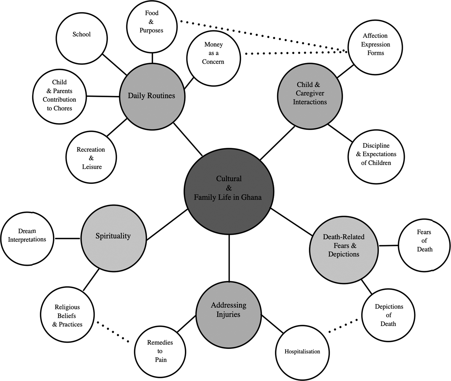 The current qualitative study of children’s story stem narratives produced a broad range of narrative themes that seem to be imbued with the lived experience and emotional concerns of young school-age children growing up in contemporary urban Ghana. Five key themes were identified in our sample: daily routines and concerns, close interactions with caregivers, death conceptualizations, spiritual beliefs and practices, and healthcare-related responses—each with distinct subthemes. The findings may be taken to support the utility of this ‘child-centred’ method in a cultural context in which more socially hierarchical and collectivist values seemed to be operating in Ghana. However, when considering the ‘validity’ of story stems in different cultural contexts, a crucial point is that our employment of this indirect method was not necessarily intended to reveal children’s literal objective experience (which would be better captured using direct observational study combined with parent and teacher reports), but rather to explore children’s meaning-making of their lives, including their responses to challenging situations. Thus, the children’s narratives reflect perceptual, metaphorical and otherwise cognitively mediated experience that is nonetheless meaningful for the child, and which here we carefully attempt to consider possible interpretations for the current findings.