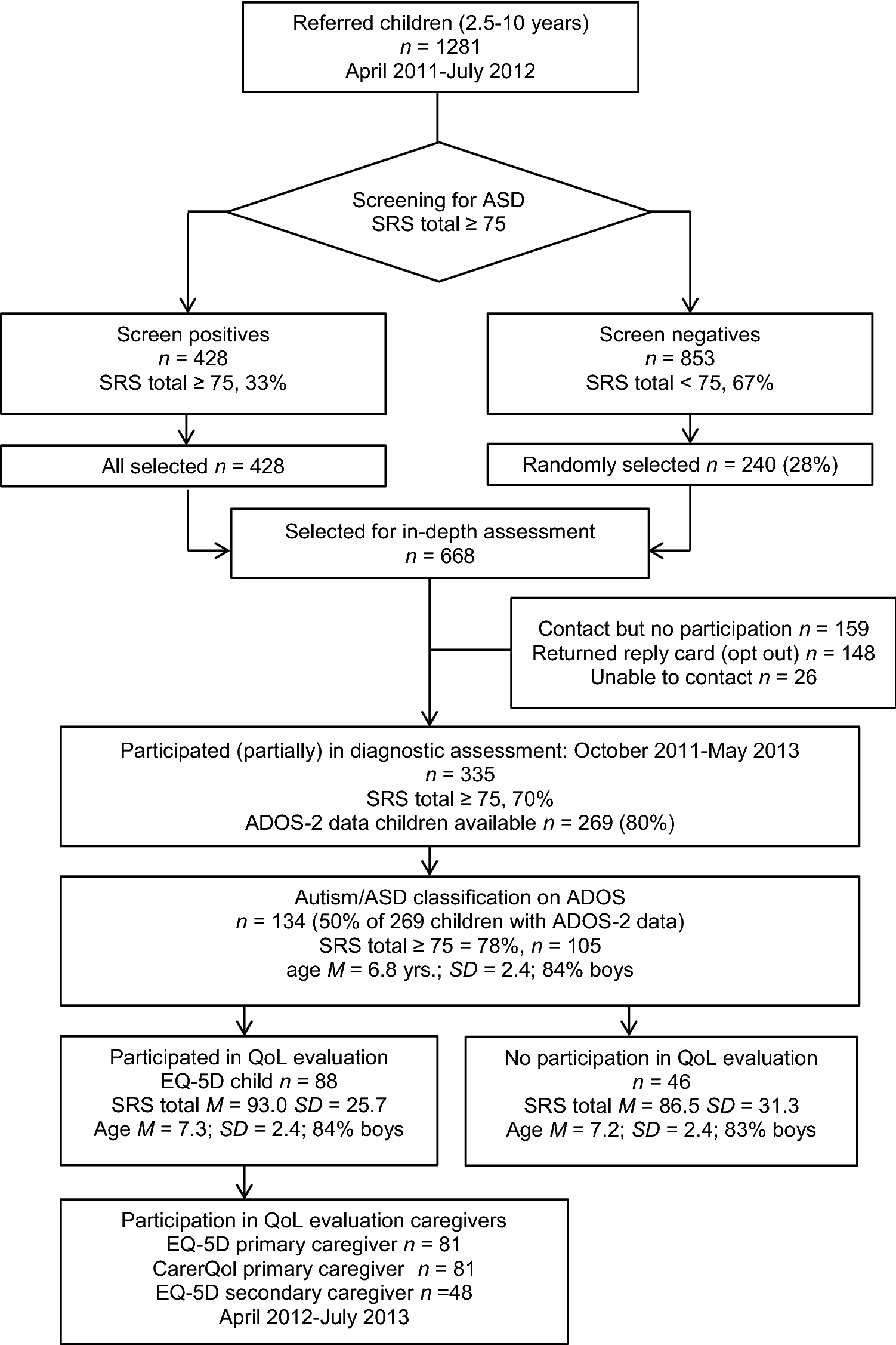 Children with a high risk of ASD were selected by using a total raw score of 75 or more on the SRS as the cut-off value, thus differentiating between high risk of ASD versus other psychiatric problems with a sensitivity of 0.85 and a specificity of 0.75 (Constantino and Gruber 2005). Besides all children with a positive screening result based on the SRS (total raw score ≥ 75; n = 428), a random selection of children with a negative screening result based on the SRS (total raw score < 75; n = 240), were invited with their caregivers for an in-depth assessment (total n = 668), using an oversampling design (Dunn et al. 1999; Duvekot et al. 2017). We measured autistic traits in the children with the Autism Diagnostic Observation Schedule, second edition (ADOS-2, Lord et al. 2012; De Bildt et al. 2013). The assessment also included child emotional and behavioral problems, child and caregiver HRQoL, and CarerQol. The participating caregivers were the most involved informal caregivers, who predominantly raised and cared for the child. Caregivers reported whether they were the primary or secondary caregiver, as well as their relationship with the child (biological parent, foster parent, adoption parent, grandparent, step-parent, or otherwise). Formal caregivers, such as physicians, psychologists, or social workers, were not included in the study. The procedure, instruments, and questionnaires were identical for the participating screen-positive children and their families as well as for the screen-negative children and their families in the sample. The flowchart of the study (Fig. 1) shows that the final study sample consisted of 88 children with a classification ‘Autism’ or ‘Autism Spectrum Disorder’ on ADOS-2 data and available information about their HRQoL (of which 72 children with a total SRS raw score ≥ 75). Because no HRQoL questionnaire was available for 46 (134 minus 88) children with an ADOS ASD classification, they were excluded from the current study.