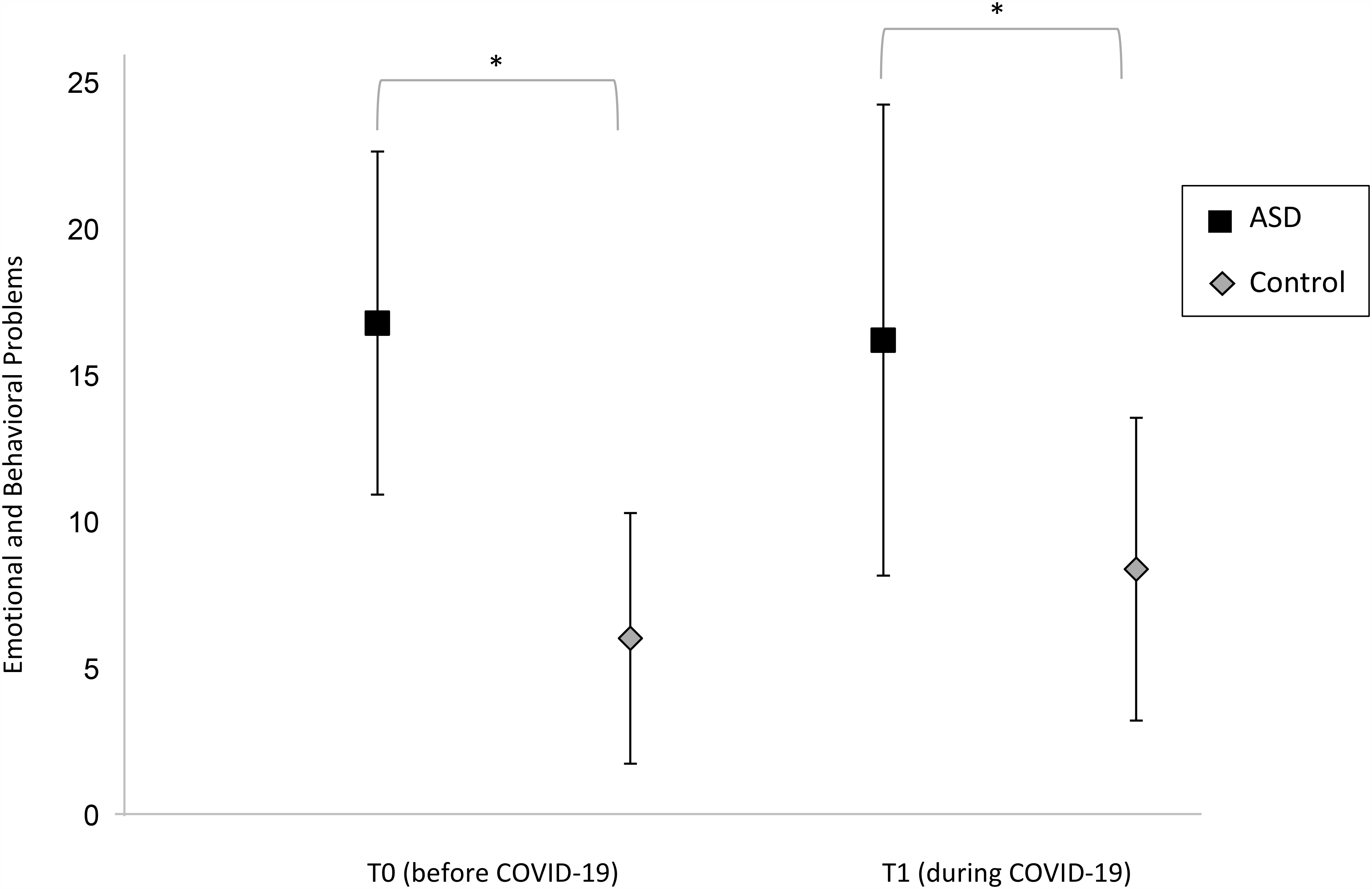 The COVID-19 pandemic offers a unique opportunity to examine how challenging or stressful situations affect families from populations potentially at risk. Obtaining more knowledge on the impact of the pandemic on children with ASD and protective factors at the family level is crucial for providing tailored interventions and support for children with ASD and their parents. This knowledge may also be used to better assist vulnerable families during other life-changing events, such as following natural disasters or health crises. Therefore, the current study aimed to (1) investigate the impact of the COVID-19 pandemic on EB-problems of children with ASD as compared to children without ASD. Uniquely, we had pre-COVID-19 data on children’s functioning, which enabled us to determine the impact of the COVID-19 pandemic on children’s problems more objectively. Based on the available literature, we hypothesized that, on average, children with ASD experienced a larger increase in EB-problems from pre-COVID-19 (T0) to during COVID-19 (T1) than children without ASD.