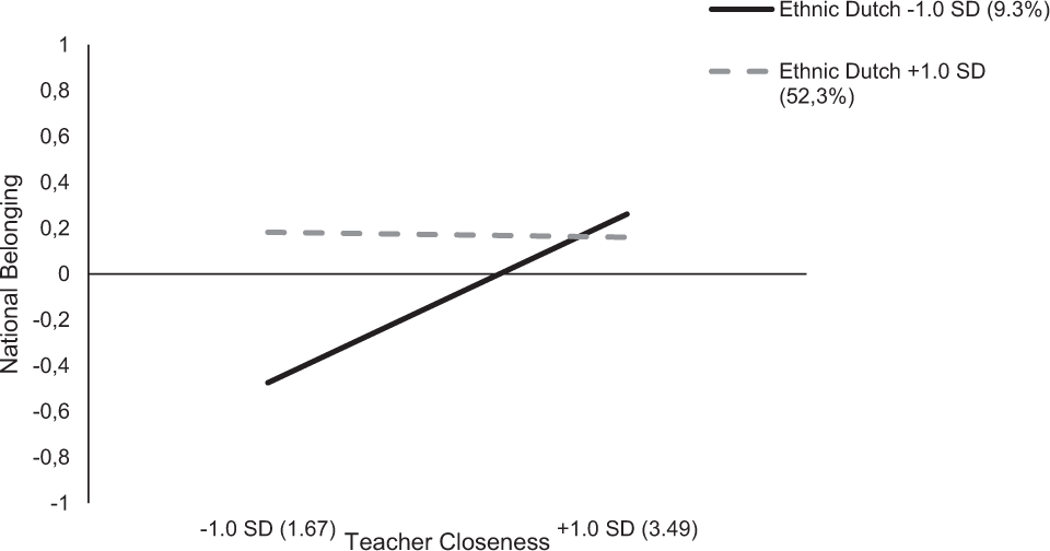 Based on Intergroup Contact Theory (Allport, 1954) and the Common In-Group Identity Model (Dovidio et al., 2007), it was expected that the national belonging of ethnic minority students would depend on the share of ethnic Dutch students in their classroom (contact opportunity) and the relational closeness (contact quality) with their teachers. The findings supported both of these hypotheses. Consistent with earlier research (e.g., Agirdag et al., 2011), it was indeed found that having more ethnic Dutch classmates and a closer relationship with their teachers contributed to a stronger sense of national belonging. Moreover, the relationship with the teacher was even more important in classrooms with fewer ethnic Dutch children. These findings suggest that a mixed school population in terms of students’ ethnic background can help ethnic minority students to feel at home in their host society. However, due to residential segregation (Bolt et al., 2010), not all schools have such a mixed ethnic population. The findings seem to suggest that in these cases, high-quality relationships with teachers, can compensate for a lack of contact opportunities with ethnic majority classmates. For future research it would be interesting to examine whether this effect is due to the ethnic majority background of the teacher (as most likely all or most teachers in the sample had an ethnic Dutch background) or whether this also holds for teachers with an ethnic minority background. It may be that ethnic majority teachers are a source of interethnic contact for ethnic minority students (Thijs & Verkuyten, 2012), or alternatively, that the teacher, regardless of their background, is considered to be a representative of the “host” society, and thus important for ethnic minority children’s sense of national belonging.