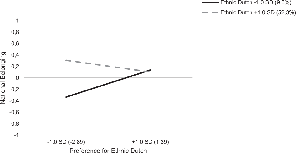 The present study also investigated the effect of preference for ethnic Dutch people on ethnic Dutch students’ national belonging. Again a positive score indicated a preference of classmates in favor of ethnic Dutch students. On average, this perceived preference was weak but there was also no strong preference for the in-group (M = 1.28; SD = 1.55). The results, as presented in Table 4 under Model 2, indicated that the main effect of perceived preference nor its interaction with classroom composition were significant predictors of ethnic Dutch students’ national belonging.