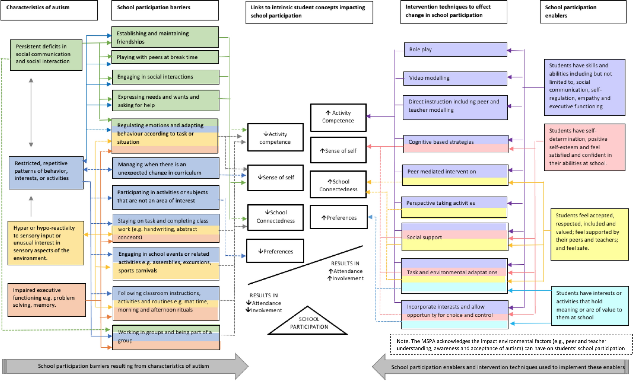 Parents and educators identified several intrinsic (e.g., students school connectedness and sense of self) and extrinsic (e.g., school culture and educator attitudes, knowledge, and skills) factors impacting the school participation of primary school students on the autism spectrum and emphasised the importance of developing school-based interventions that focus on addressing the psychological aspects of students’ school experience (Hodges et al., 2020). More detailed findings are reported elsewhere (Hodges et al., 2020) and helped to verify and enrich school participation barriers identified from the literature in the MSPA.