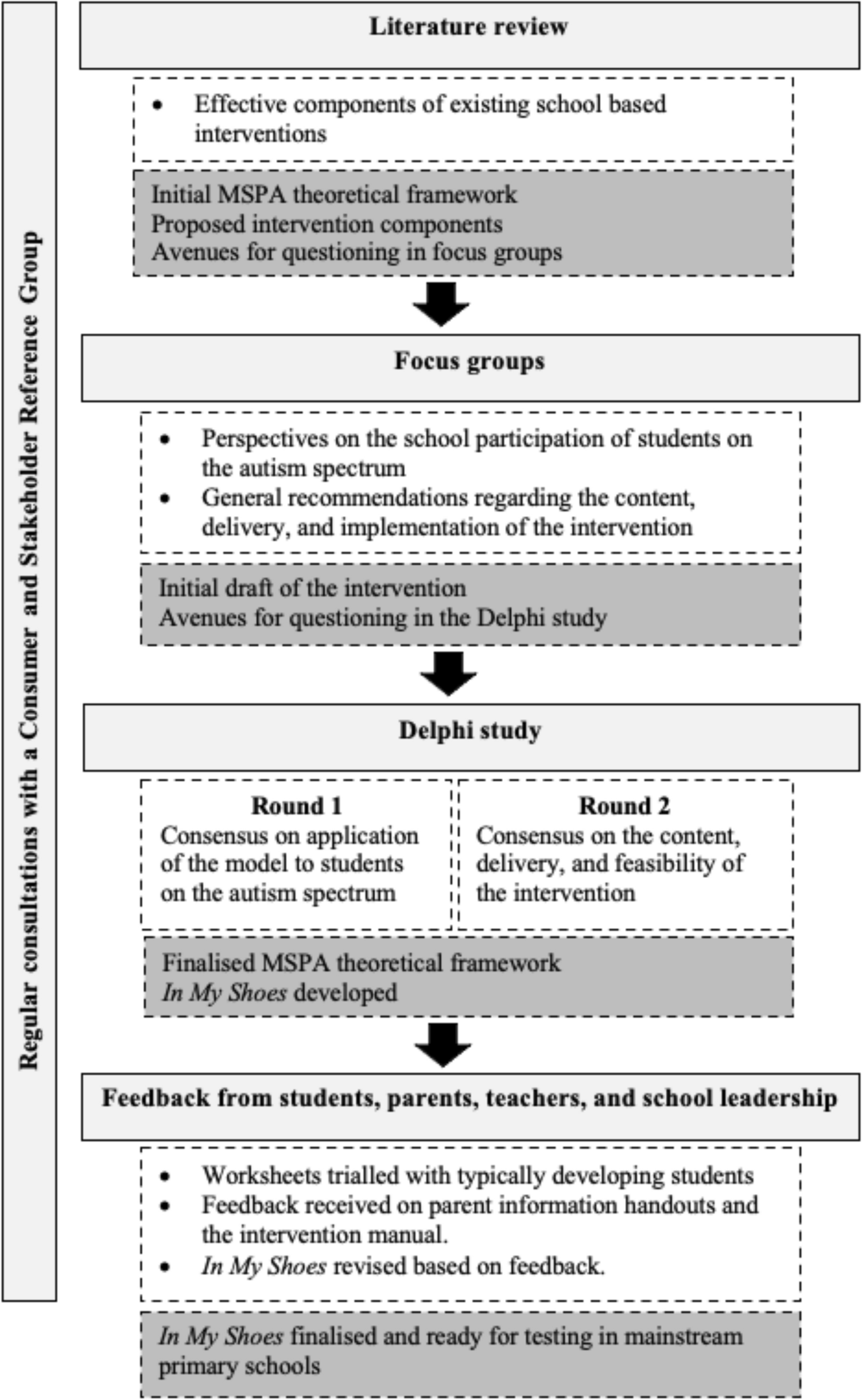The imperative to develop a school-based intervention to improve the school participation of students on the autism spectrum arose from growing literature on the long-term negative impact of reduced school participation on student outcomes (Furlong et al., 2003; Maddox & Prinz, 2003; Shochet et al., 2006). We designed In My Shoes based on our own theoretical model of school participation and autism and a series of research activities, which aimed to gain iterative feedback from students, parents, educators, clinicians, and researchers with expertise in the topic area. The MSPA was imperative in defining constructs of interest to be targeted in the intervention and ensured the intervention was rooted in theory and evidence. Each step in the research process offered valuable comments and revisions to shape the intervention.