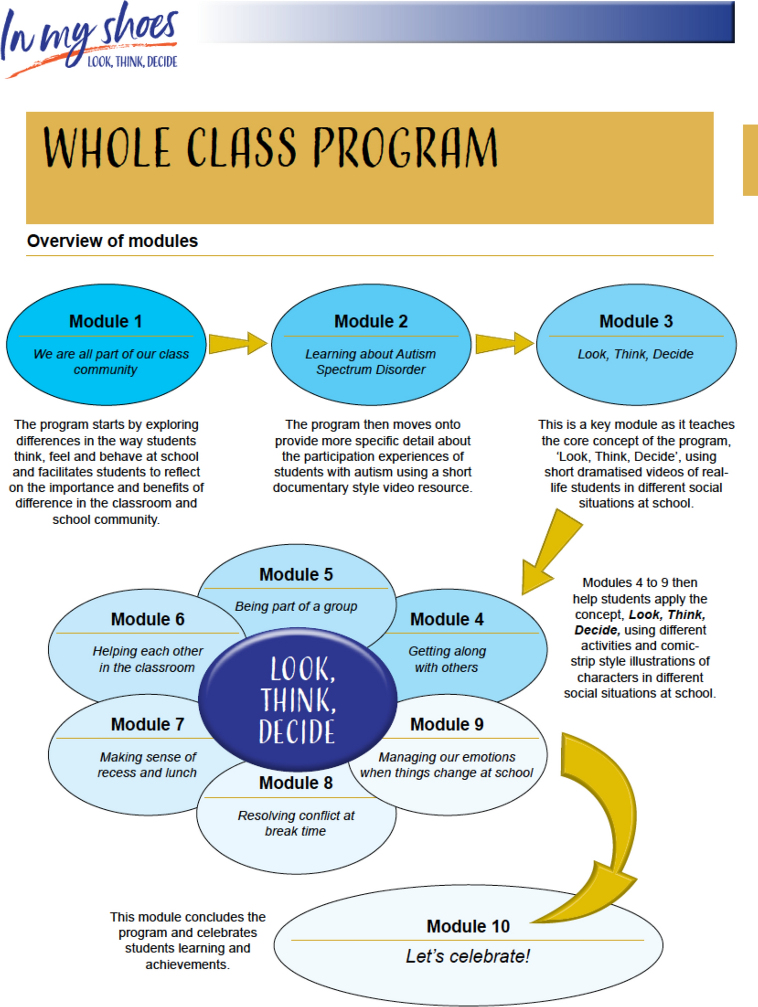 In My Shoes is designed to be delivered over the course of a school term (approximately 10 weeks) and includes the following components: (1) standardised online professional learning and ongoing face to face or online support for teachers and school leadership staff; (2) teacher-led whole class lesson plans; (3) peer training for selected peers; (4) activity ideas to incorporate key messages across the whole school; and (5) weekly parent information handouts and invitations for parents to participate in the intervention. Intervention resources are made available to schools on a USB memory stick and include professional learning video presentations, an online interactive PDF manual, printable lesson plans, worksheets and resources, and interactive video resources with real-life students on the autism spectrum sharing their school experiences.