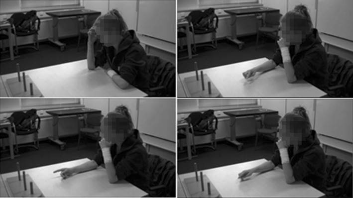 In addition, we looked at form (pointing vs. iconic) and frequency of gesture. Almost all instructed and spontaneous gesturing consisted of pointing gestures (see Fig. 1 for an example) with three exceptions. Two participants briefly used counting gestures, and one participant briefly used iconic gestures with two hands simulating picking up and moving all the discs. Given the practical absence of iconic gestures, as a measure of gesture frequency, we only counted the number of pointing gestures; in such a way that each rest point after a pointing gesture (either whole hand- or finger-pointing) was considered as one instance. A research assistant counted all the gestures, and the first author independently counted 10.4% of the sample to check for reliability. A high degree of reliability was found between both counts; the average intra class correlation coefficient was 0.991 with a 95% confidence interval from 0.910 to 0.996, p = .001.