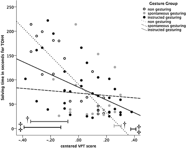 Regression slopes for each gesture group (non-gesture vs. spontaneous gesturing vs. instructed gesturing) on amount of time in seconds necessary to solve the problem on the difficult 4-disc TOH, with centered VPT score on the horizontal axis. The “†” denotes the region where the effect of spontaneous gesture prevalence (vs. no gesture) was significant. The “‡” denotes the region of significance for instructed gesture prevalence