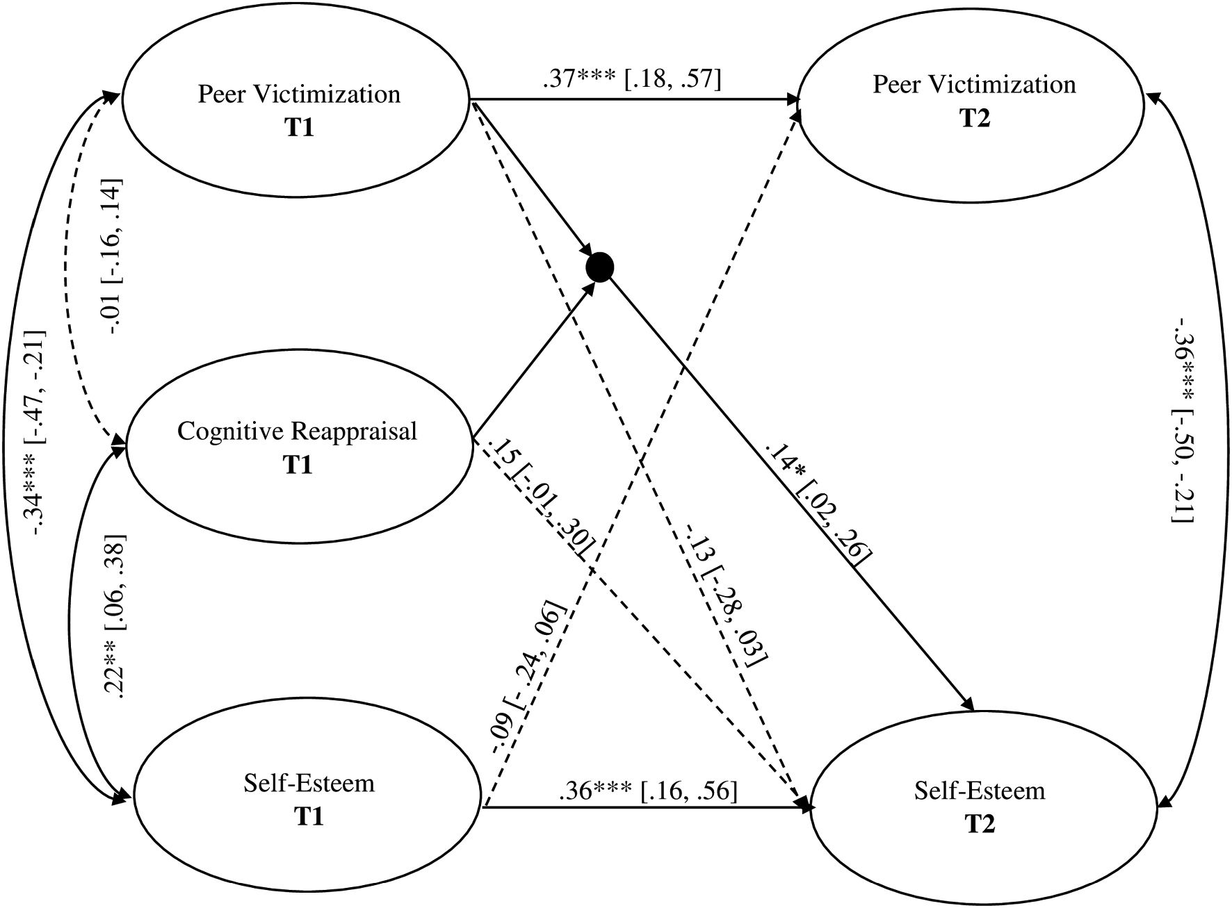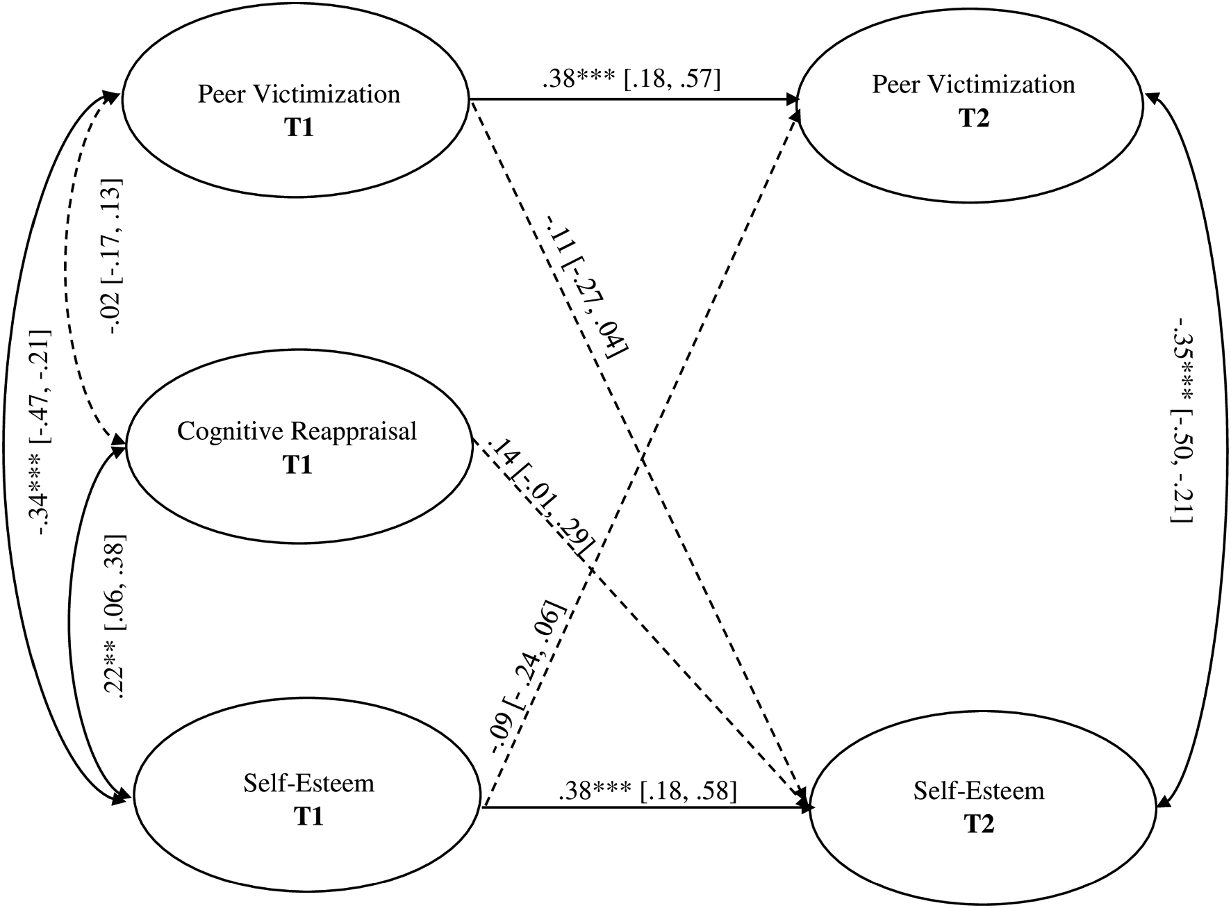 Descriptive statistics and bivariate correlations for all study variables are presented in Table 1. All but one associations were significant, small to medium, and in the excepted direction. Significantly greater levels were found among boys than girls in self-esteem at both times of measurement (T1, t(283) = 2.07, p = 0.04; T2, t(281) = 2.08, p = 0.04). No significant sex-based differences were detected in mean levels of peer victimization (T1, t(282) = − 0.84, p = 0.40; T2, t(276) = − 0.27, p = 0.79) and cognitive reappraisal (T1, t(298) = 1.47, p = 0.14).