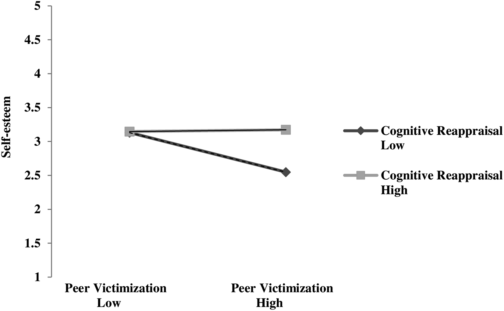 Using a χ2 distribution, the log-likelihood ratio test was not found to be significant (D = 3.9, p = 0.07), indicating that M0 (i.e., model without the interaction effect) did not represent a significant loss in fit relative to M1 (i.e., model with the interaction term). Therefore, no conclusions regarding M1’s fit could be made; M1 could be equal to or worse than M0. The interaction effect was significant, β = 0.14, SE = 0.06, p = 0.02, 95% CI = 0.02, 0.26. Peer victimization was negatively related to later self-esteem, but only for youth displaying low levels of cognitive reappraisal, b = 0.29, SE = 0.12, p < 0.05). For early adolescents with high levels of cognitive reappraisal, peer victimization was not found to predict any changes in self-esteem over time, b = 0.01, SE = 0.01, p = 0.89. Figure 3 represents the different relationship between peer victimization at T1 and self-esteem at T2 depending on the level of cognitive reappraisal at T1. The interaction plot showed that for early adolescents displaying high levels of cognitive reappraisal at T1 (1 standard deviation above the mean) the slope was relative stable in the prediction of peer victimization at T1 on self-esteem at T2, whereas for early adolescents displaying low levels of cognitive reappraisal (1 standard deviation below the mean), the slope was relative steep. This graph indicates that early adolescents with low levels of cognitive reappraisal are more vulnerable to low self-esteem following peer victimization, and that cognitive reappraisal mitigates the prospective effect of peer victimization on self-esteem.