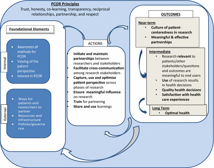 The model is organized around three concepts: (1) foundational elements required for PCOR; (2) actions or behaviors involved in conducting PCOR; and (3) outcomes the results of actions using the foundational elements. Principles provide the ethical backdrop for PCOR. The extent to which research teams demonstrate the principles can be operationalized and measured. Their presence in this model is based on the premise that these principles must be demonstrated for the research to be PCOR. The extent to which research partnerships embody the principles can be positively and negatively impacted by the concepts in the model; that is, some principles like trust may be increased over time through positive experiences during the research process.