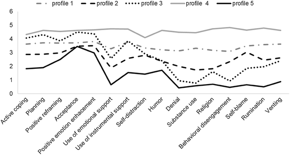 The one-step model of LPA revealed the following: (1) a solution with five different coping profiles suited the data best; (2) socio-medical covariates, except for education, were not related to the profiles’ membership. Further analysis with SWB as a distal outcome showed that higher intensity coping profiles have significantly worse SWB when compared with lower intensity coping profiles. However, the lowest SWB was noted for mixed intensity coping profile (high adaptive/low maladaptive).
