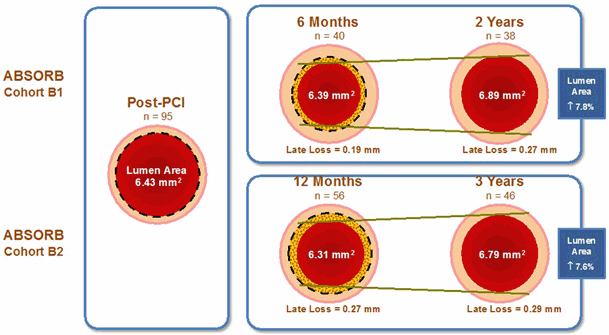Imaging with intravascular ultrasound demonstrated late lumen enlargement of the scaffolded lesions in the ABSORB Cohort A and B patients. This observation could represent a paradigm shift from late lumen loss to late lumen gain when applying BVS technology ([12], Fig. 2).