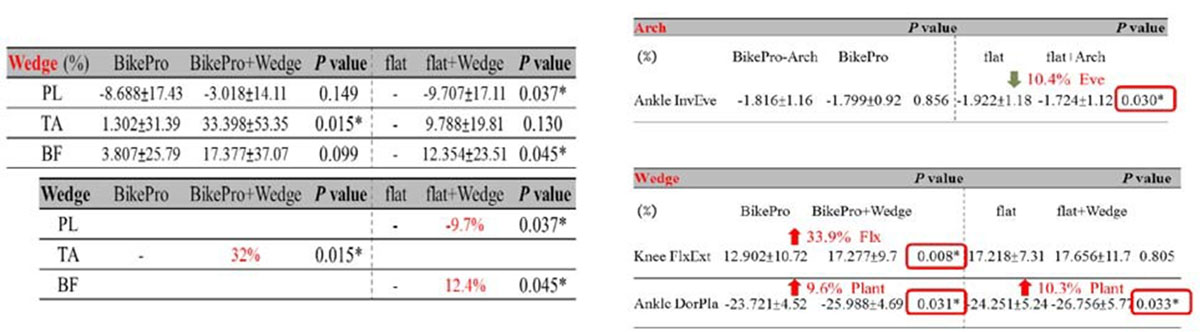 The muscle activation time reduced for the biceps femoris(6.8% , p=0.005) in comparision with the off-counter insoles. Combined with wedge it significantly increased the tibialis anterior EMG peak(32% , p=0.015) as well as the EMG integral (33%, p=0.019), and the integral of biceps femoris was also increased (12.5% , p=0.048) when vs. without the wedge. The arch support decreased the peak knee sagittal plane moment on the same performance, increased efficiency during cycling. With the wedge, the high forces found the hallux region and first metatarsal head region which increased the peak knee and ankle moment (Figure 1)