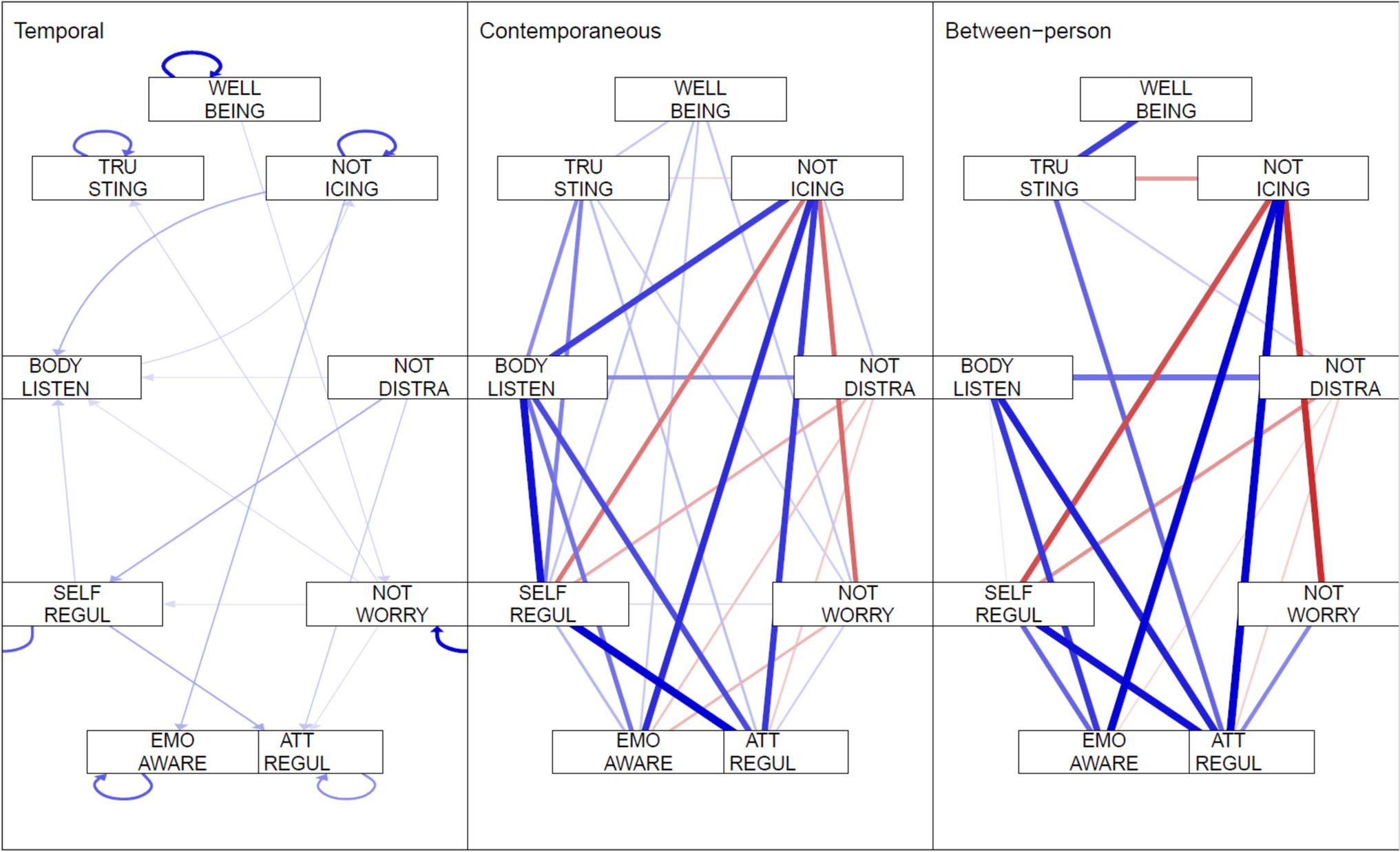 Three network models of panel time-series data: temporal, contemporaneous, and between-person. Note: directed associations (with arrows) represent regressions from previous week of measurement (in the temporal network, left); dotted lines represent negative associations; the more black, the stronger the association; contemporaneous (middle) and between person networks (right) represent partial correlations or undirected associations (without arrows); NOTICING, Noticing; NOT WORRY, Not worrying; NOT DISTRA, Not distracting; ATT REGUL, Attention regulation; EMO AWARE, Emotional awareness; SELF REGUL, Self-regulation; BODY LISTEN, Body listening; TRUSTING, Trusting